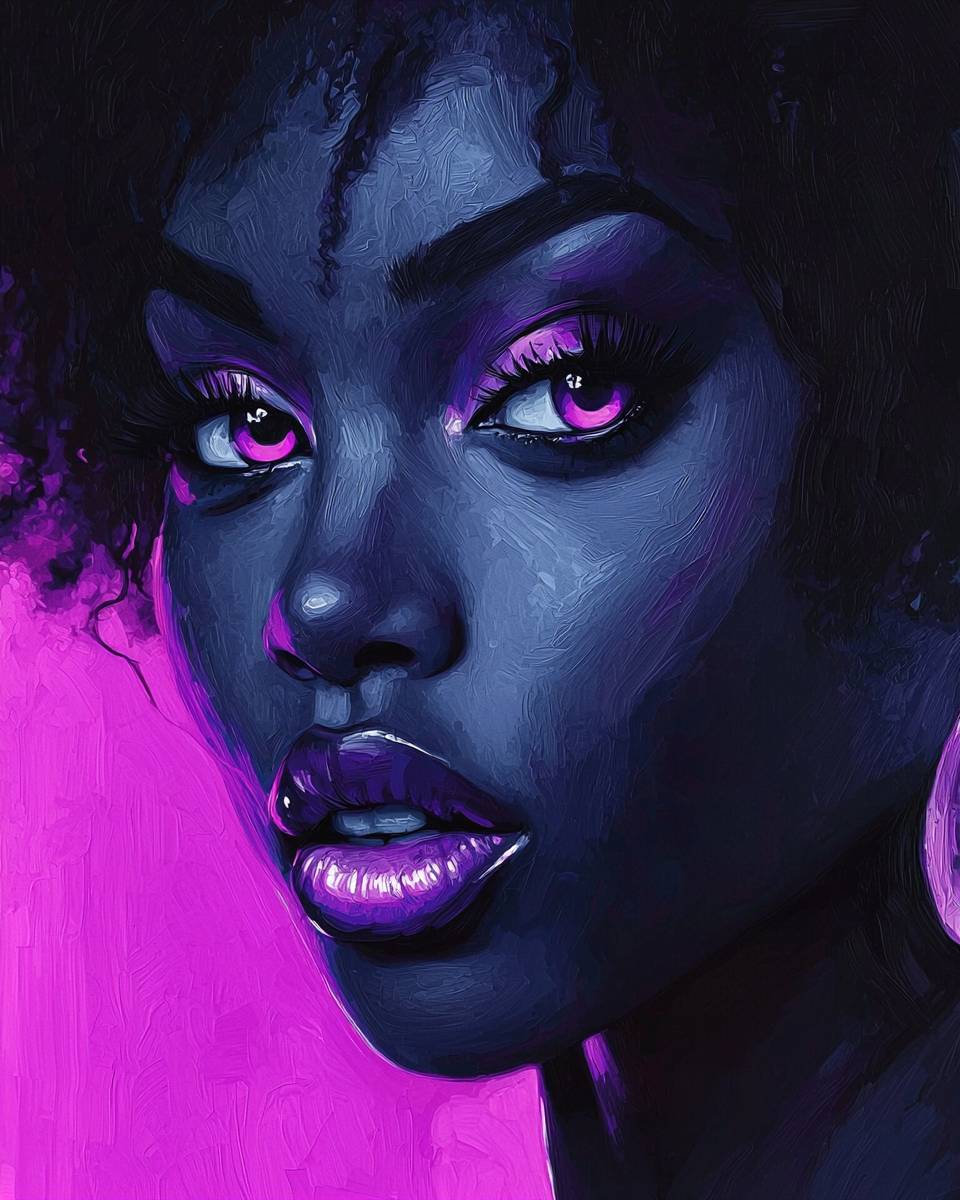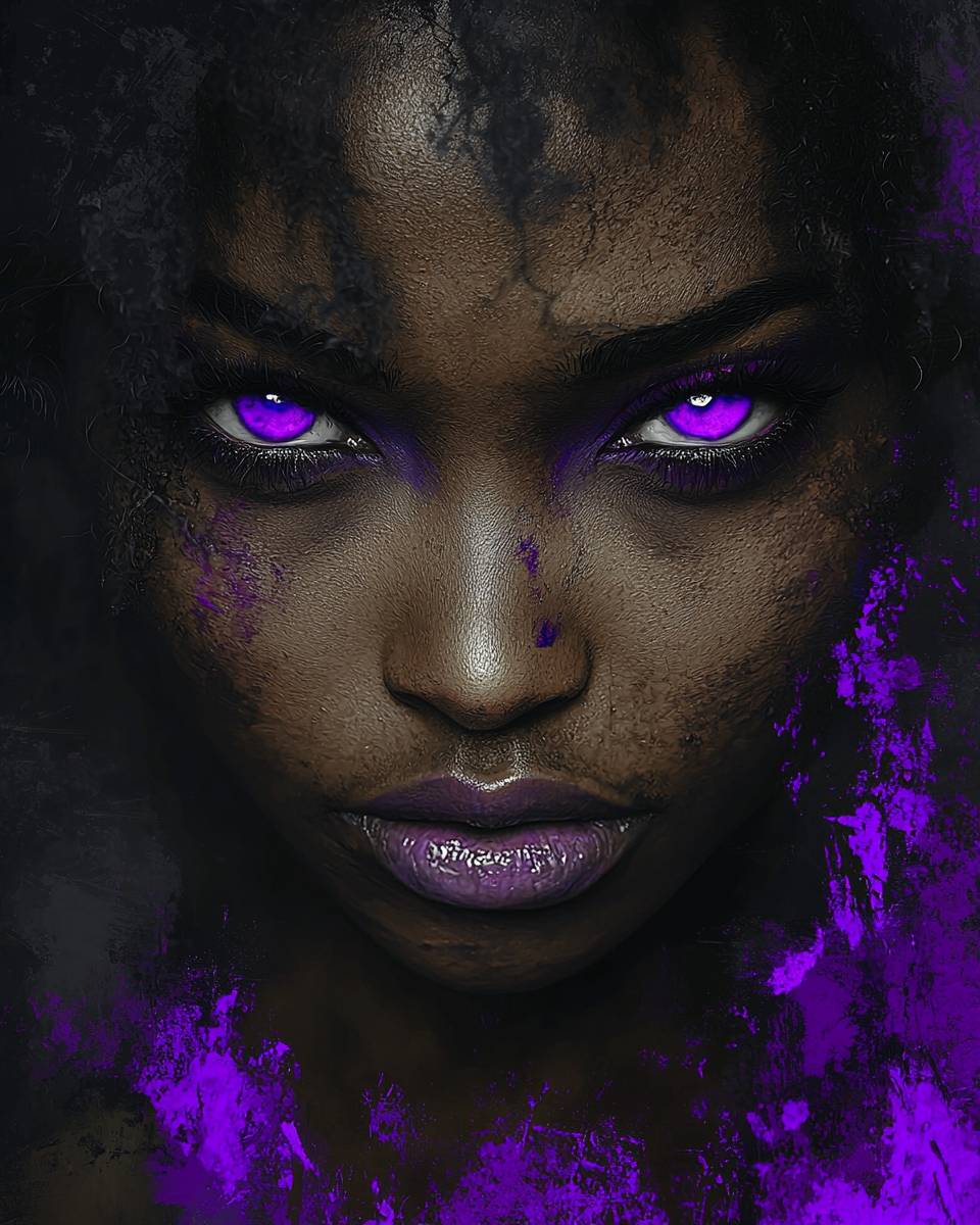 An enigmatic portrait of a a beautiful afro-asian woman, capturing the essence with purple eyes in 'Chiaroscuro Neon', blending deep facial shadows with striking neon accents, in shadow deep grey and neon purple, abrasive authenticity, ambient occlusion --chaos 6 --ar 4:5 --style raw --q 2