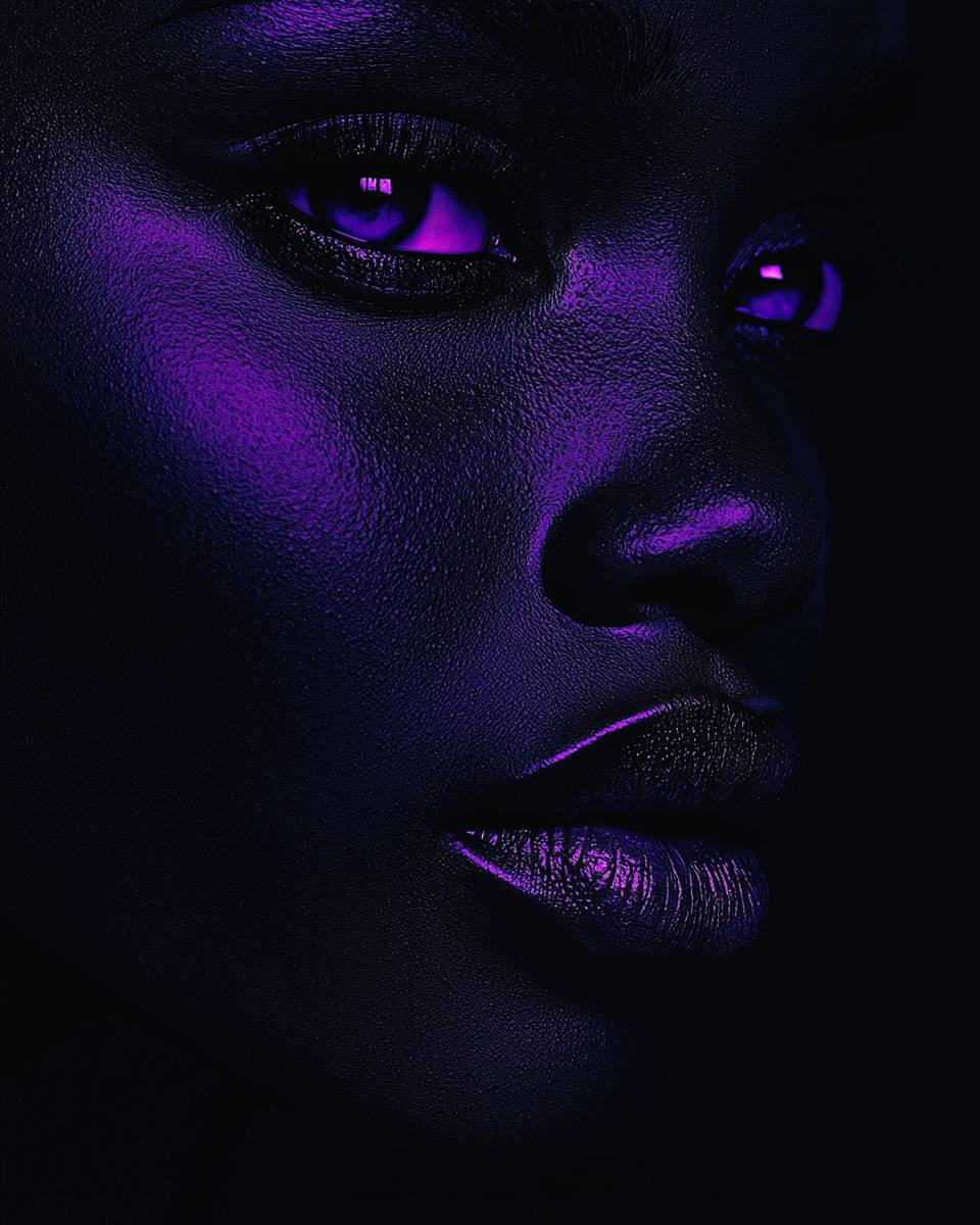 Ein geheimnisvolles Porträt einer schönen afro-asiatischen Frau, das das Wesen mit lila Augen in 'Chiaroscuro Neon' einfängt, tiefen Gesichtsschatten mit auffälligen Neonakzenten verbindet, im Schatten tiefgrau und neongrau, abrasive Authentizität, Ambient Occlusion.