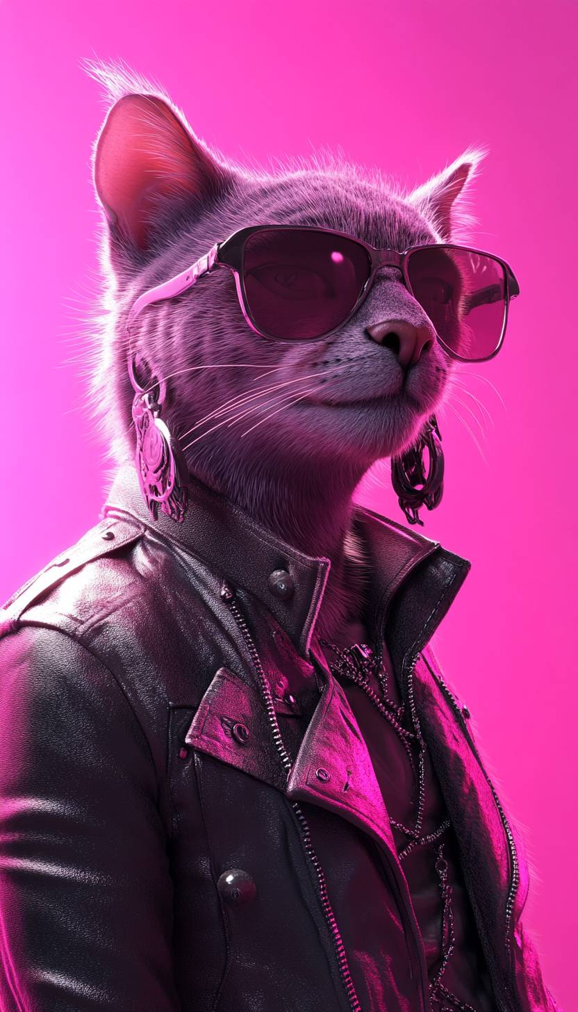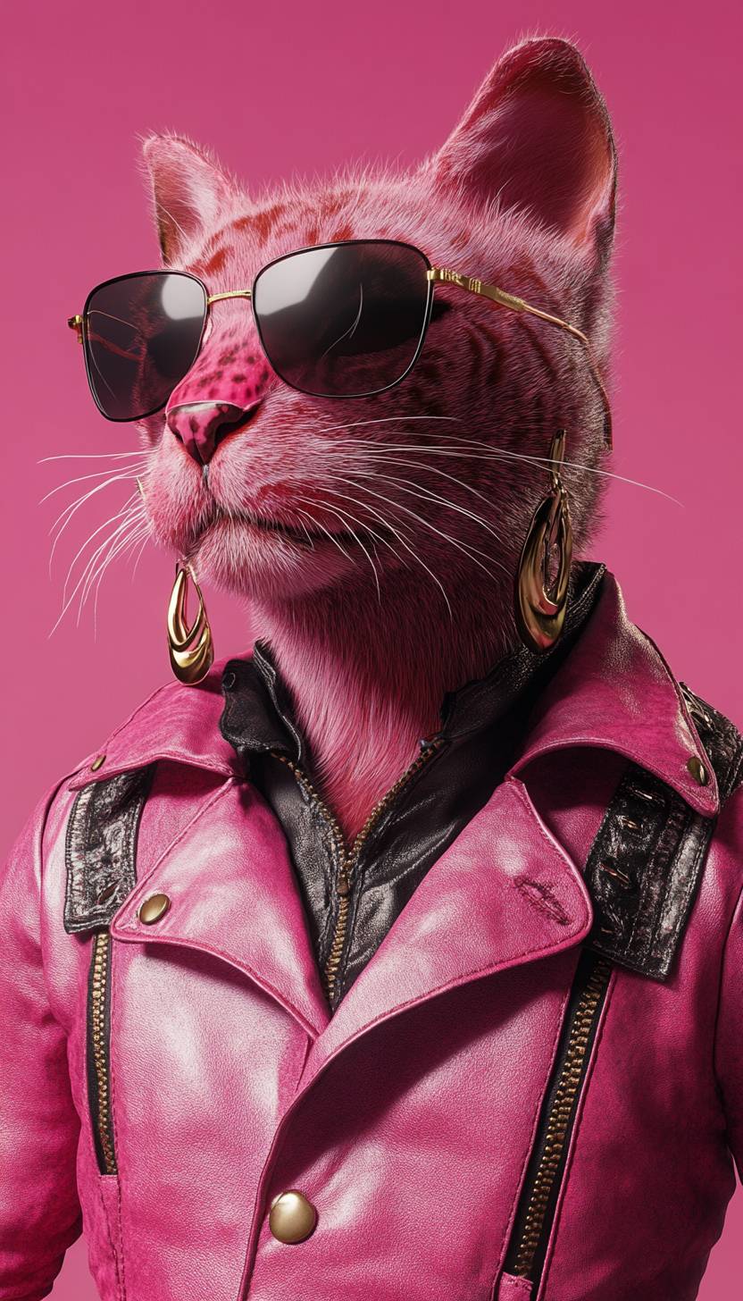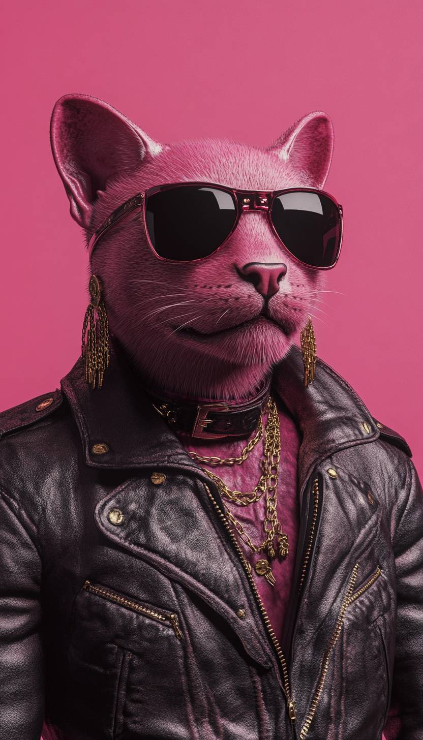 Pink old Panther in leather with sunglasses on the pink background 3d rendering stock photo, in the style of appropriation artist, high quality photo, strong facial expression, elaborate costumes, forestpunk, handsome, wearing long earrings, hyper-realistic details --ar 4:7 --v 6.1