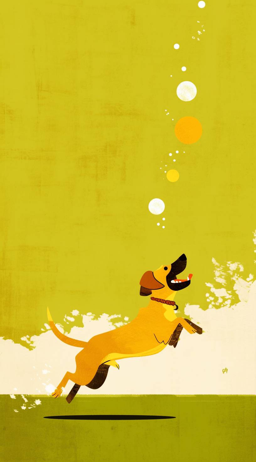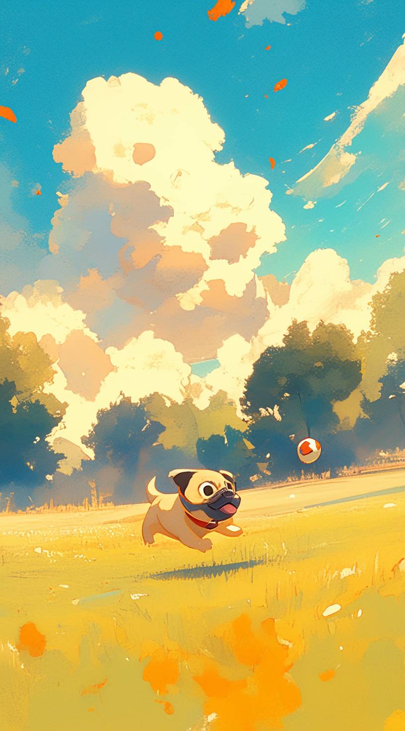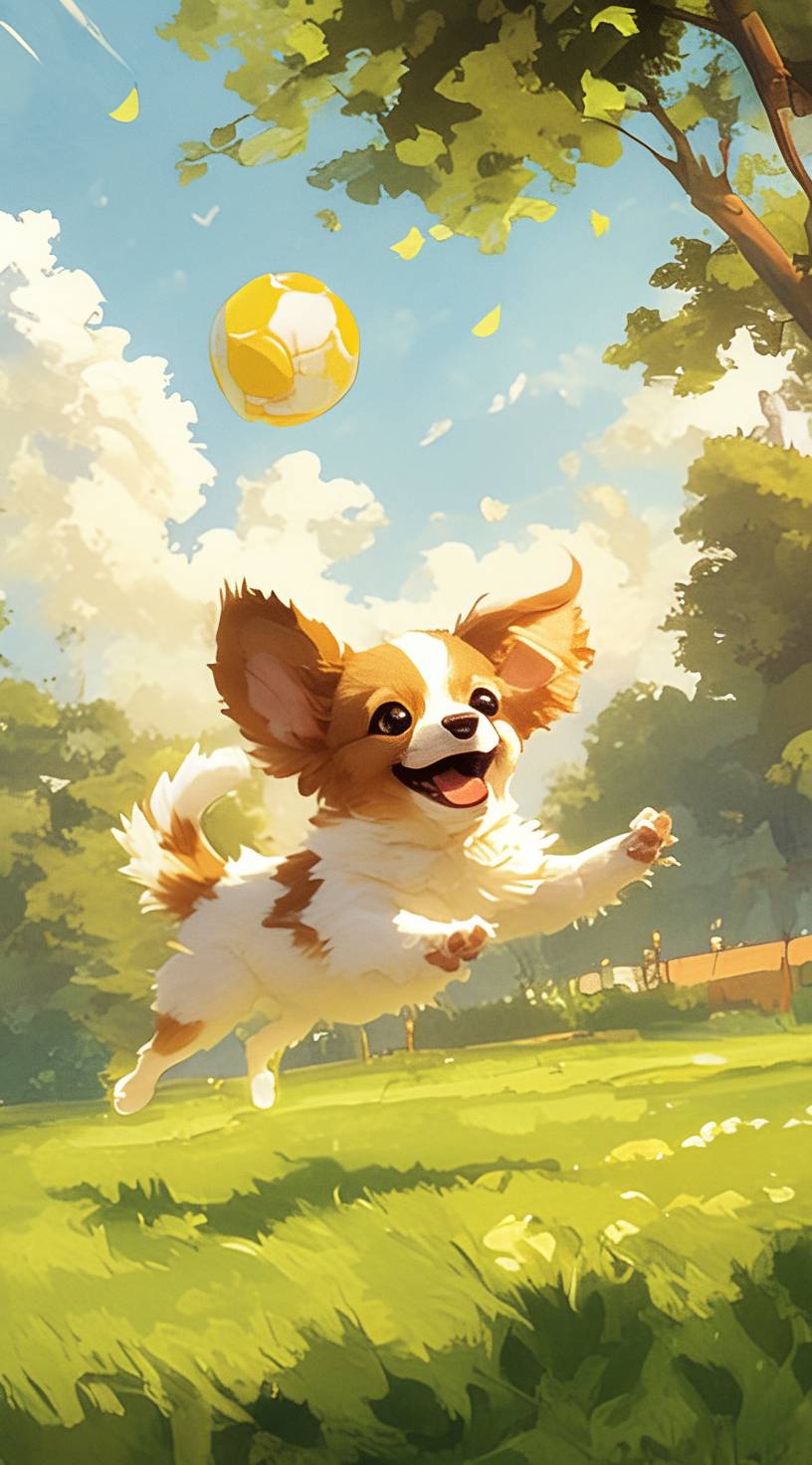 A playful puppy chasing a ball in a sunny park, bright colors, dynamic composition, simple design for a toddler book cover. --ar 71:128 --style raw --stylize 222 --niji 6