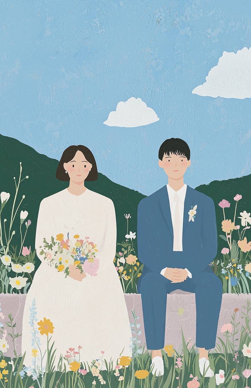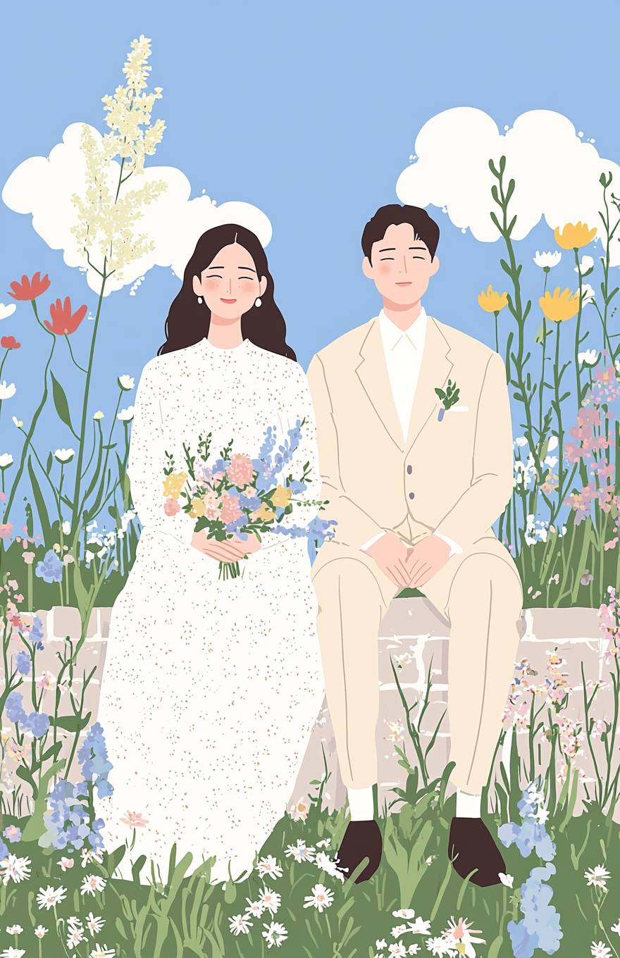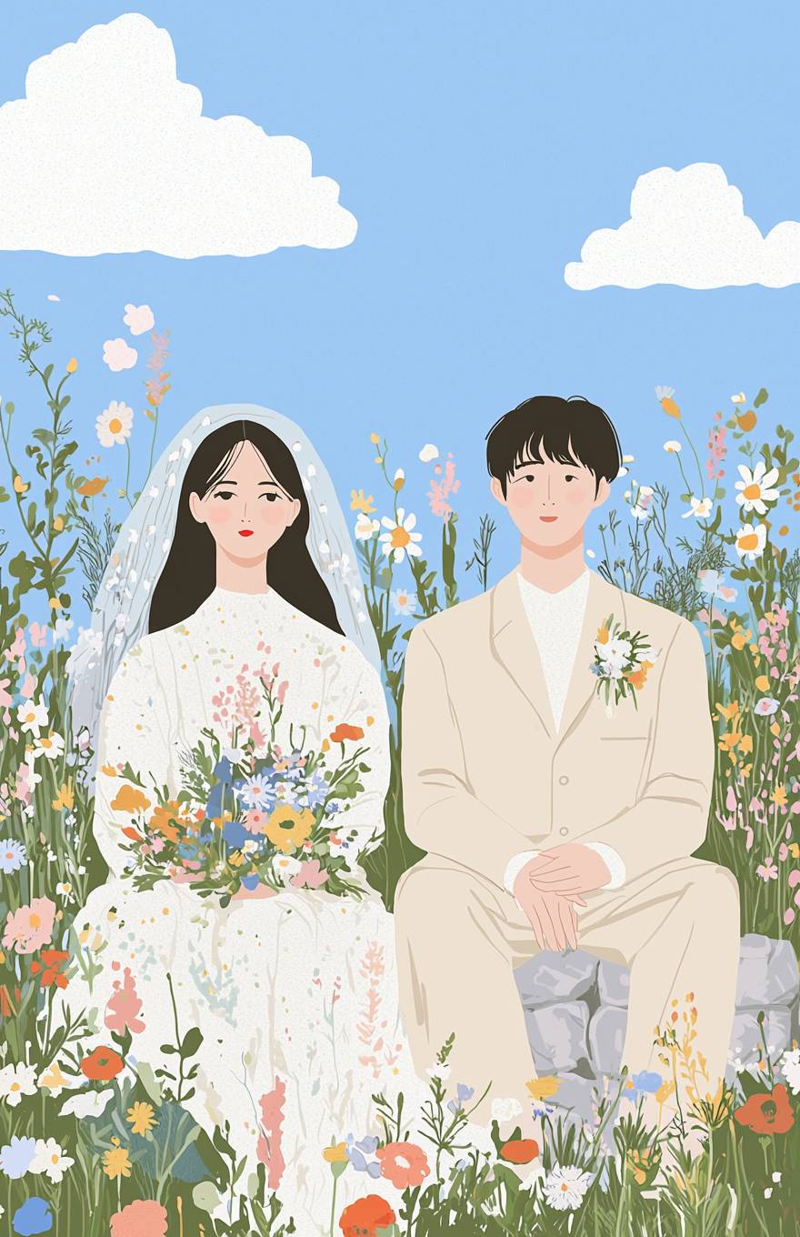 A minimalist flat illustration of an Asian couple sitting on stone walls in the grass, wearing wedding dresses and suits with flowers around them. The background is a blue sky and white clouds, surrounded by green fields full of colorful wildflowers. Bright colors, simple lines and shapes, no shadows. In the style of anime, with character design and a high resolution, without low light or dark tones. --ar 35:54 --quality 2 --style raw --personalize lfy2puc --stylize 250 --v 6.1