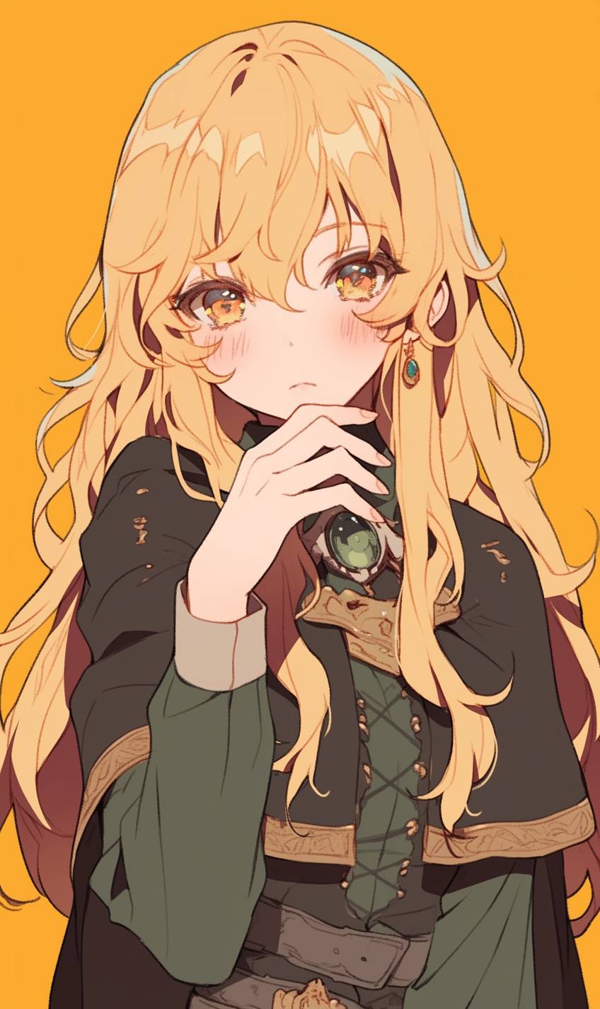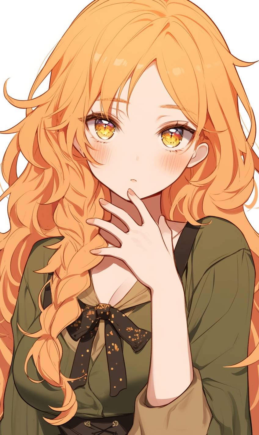 Colette Loire aus dem Anime Wistoria Wand and Sword, ein Teenager-Mädchen, schöne orange Augen, errötend, süß, komplexe Pupillen, 2D-Anime, flatte Farben.