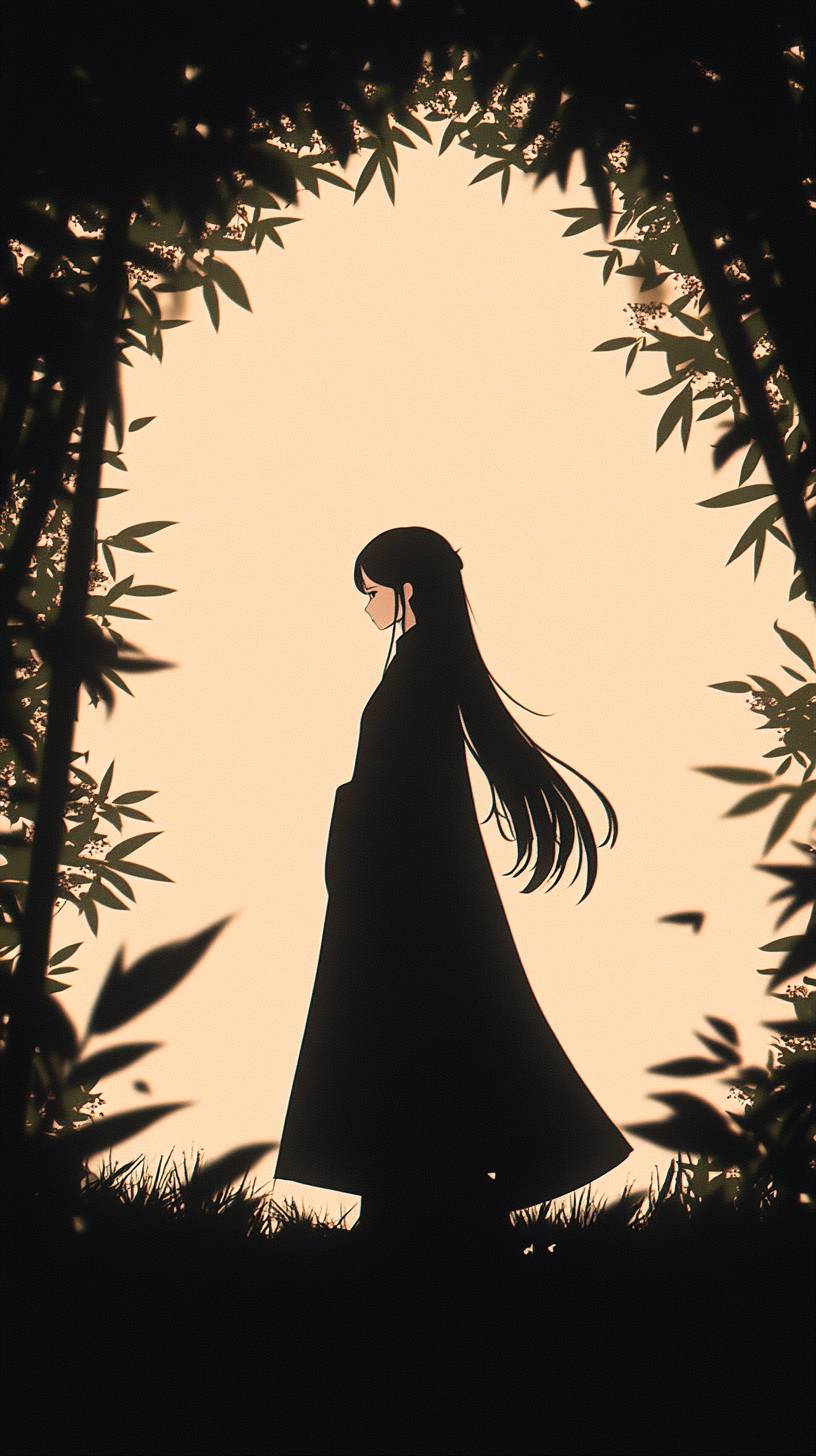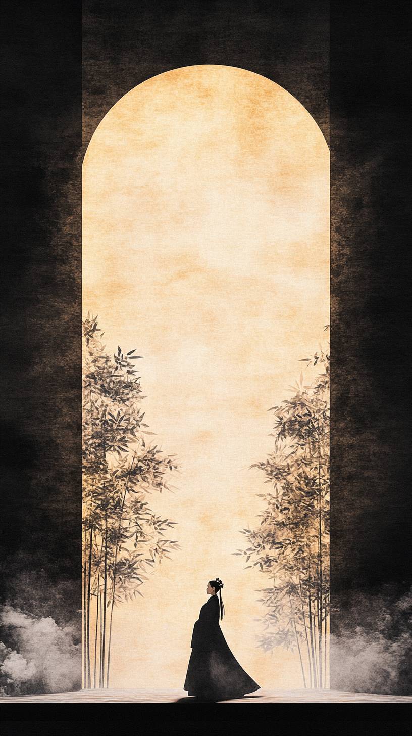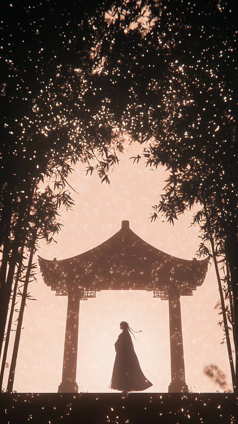 A woman in Hanfu stands among the bamboo groves, her silhouette illuminated by golden light. The scene is rendered with a minimalist aesthetic and an ethereal glow, creating a dreamlike atmosphere. This artwork captures the essence of ancient Chinese culture through its elegant composition and soft tones. It embodies simplicity and tranquility, showcasing traditional aesthetics within a modern context. The woman is dressed in traditional , with the artwork rendered in the style of minimalism and tranquility. --chaos 6 --ar 9:16 --personalize df1ce3t --stylize 750 --v 6.1