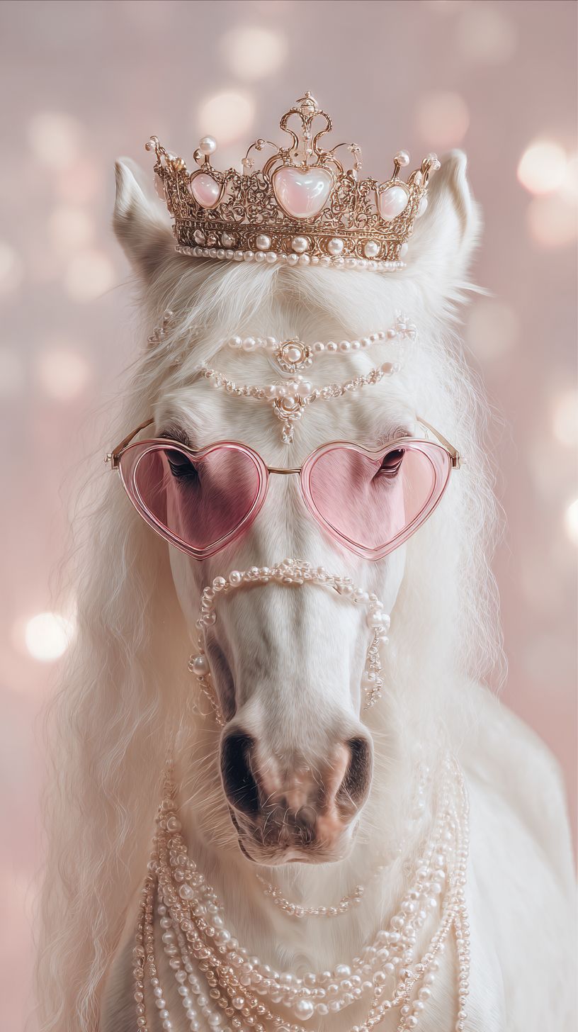 Ein glamouröses Porträt eines weißen Pferdes, Frontalansicht, eleganter aristokratischer Stil, das Pferd trägt eine zarte goldene Krone mit Perlen, lange blonde Mähne, dekoriert mit mehreren Perlensträngen, geschichtete Perlenhalsketten um den Hals, rosa herzförmige Sonnenbrille mit dünnem Metallrahmen, sanfter pastellrosa Hintergrund mit subtilen Bokeh-Lichtern, luxuriöse Mode-Editorial-Ästhetik, verspielte königliche Stimmung, ultra-detaillierte Felltextur, realistische Pferdeanatomie, weiche Studiobeleuchtung, Hochmodefotografie, traumhafte und romantische Stimmung, flacher Schärfentiefe, fine Art-Porträt, extrem detailliert, saubere Komposition, zentriertes Motiv, kein Text, kein Logo