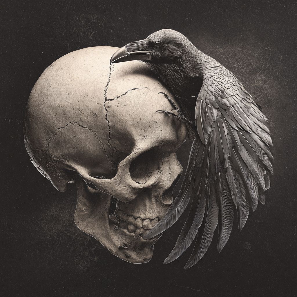 Eine symbolische dunkle Realismus-Illustration eines menschlichen Schädels und eines Raben, filmische Komposition der bildenden Kunst. Ein realistischer Schädel mit subtilen Rissen am Schädel, glatte, gealterte Knochentextur, ruhiger und gelassener Ausdruck, leicht entspannter Kiefer, der Akzeptanz und nicht Aggression vermittelt. Ein Rabe, der nah am Schädel positioniert ist, mit einem sanft ausgestreckten Flügel, der teilweise um den Schädel gewickelt ist, wodurch eine schützende Geste anstatt Dominanz erzeugt wird. Der Flügel ist natürlich gekrümmt, die Federn liegen sanft über dem Schädel, wie ein Umhang oder Schild, was Fürsorge, Schutz und stille Resilienz suggeriert. Der Kopf des Raben ist leicht nach unten geneigt, der Blick ruhig und aufmerksam, die Flügel nicht vollständig geöffnet, kontrollierte und absichtliche Bewegung. Der Rabe greift nicht an und droht nicht; er schützt, beobachtet und bleibt präsent. Dunkler Realismus und verfeinerte Schwarzarbeit-Ästhetik, inspiriert von hochwertigen Gravuren und klassischen Radierungen, ultra-detaillierte Federtexturen, präzise Linienführung, sanfte Übergänge zwischen Licht und Schatten. Subtil rauchiger Hintergrund mit tiefen Schwarz- und Negativräumen, schwacher atmosphärischer Nebel, kein Tattoo-Kontext, keine Haut, kein Körper. Niedrigkontrast-Höhenlichter, elegante Schatten, emotionale Zurückhaltung, feine Kunstillustration, cinematografische Beleuchtung, zeitlose und symbolische Stimmung.