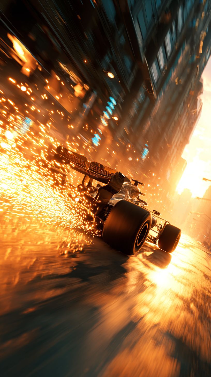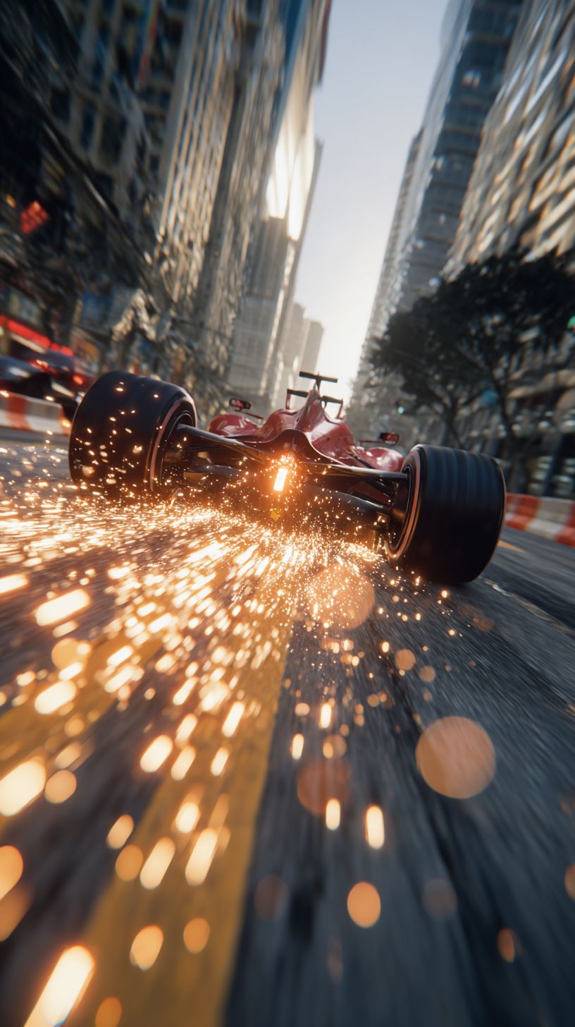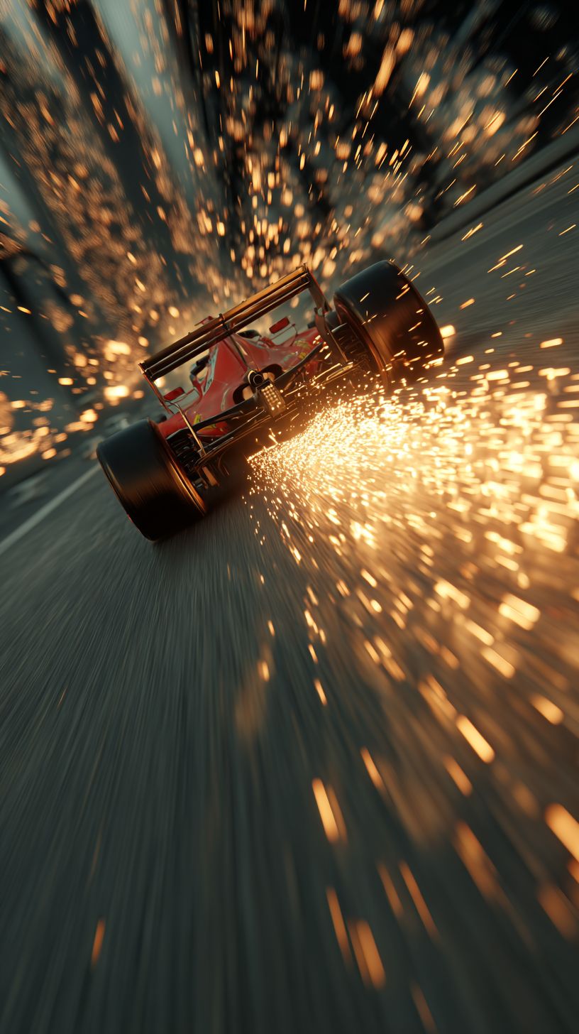 ...fd6e.jpg cinematic vertical shot, Ferrari F1 car drifting on dynamically reconfiguring track section of the 'Walking City', intense golden sparks erupting from tires, physics realism, ultra-HDR 8K --ar 9:16