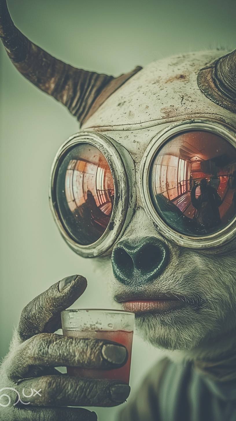 a yeti wearing a horned battle helmet and large mirrored sunglasses. Yeti is disco dancing with a cocktail in their hand, in the style of photographically detailed portraitures, celebrity photography, flickr, full body, theatrical gestures, grandeur of scale, flash photography --chaos 50 --ar 9:16 --quality 2 --style raw --personalize 6wob8bu --stylize 700 --v 6.1