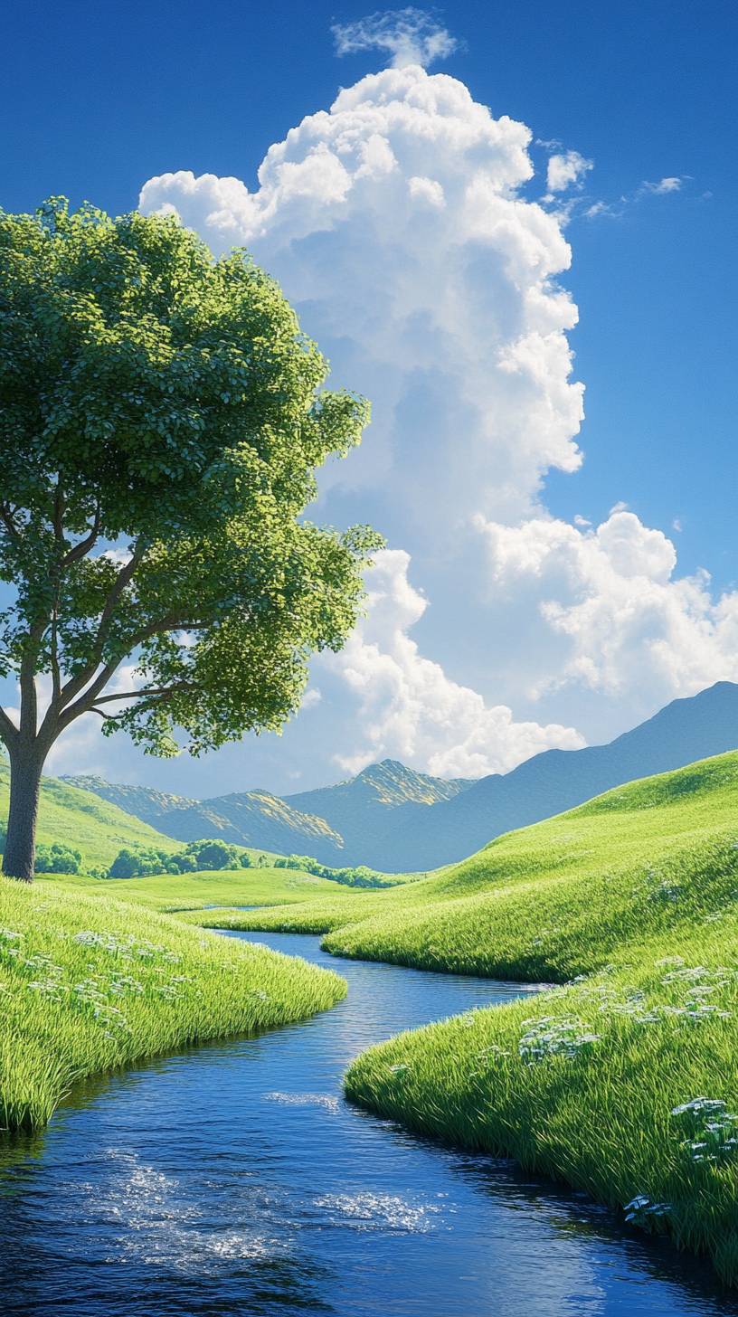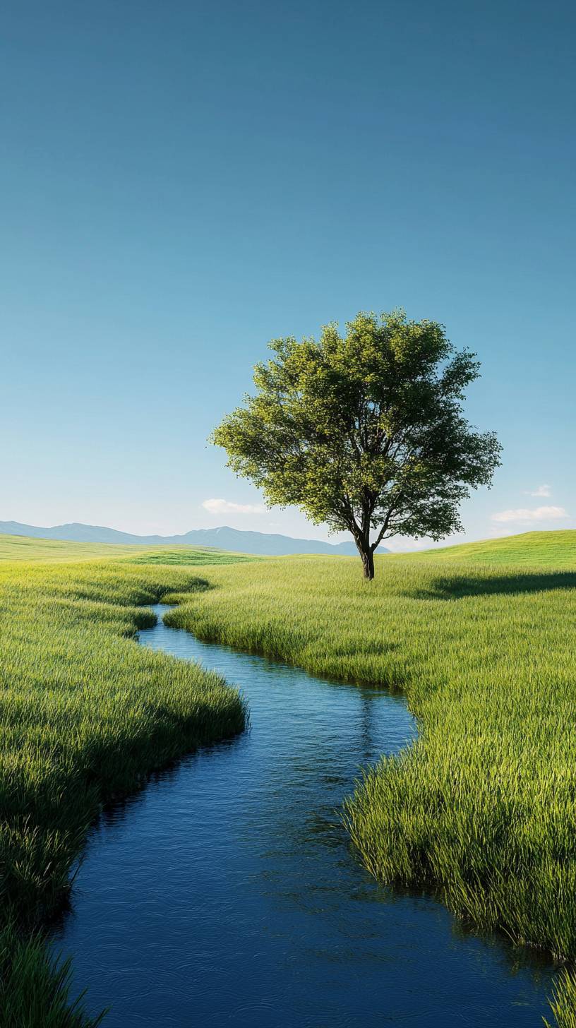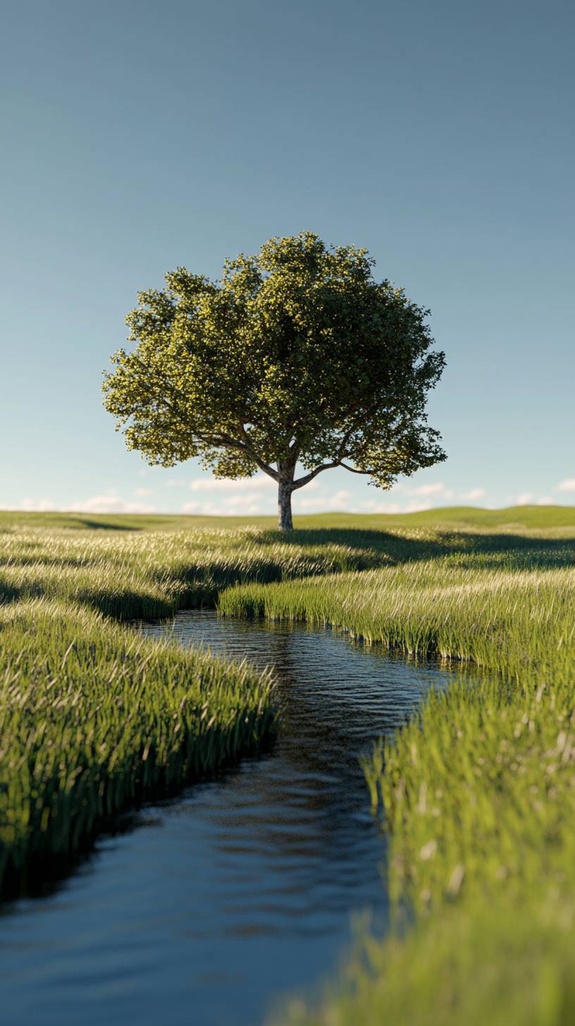 a cloudless sky; A small river separates the short green grass from the middle. A neat, clustered tree on one side of the lawn realistic --v 6.1 --ar 9:16