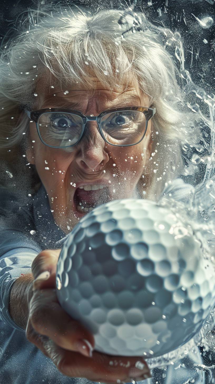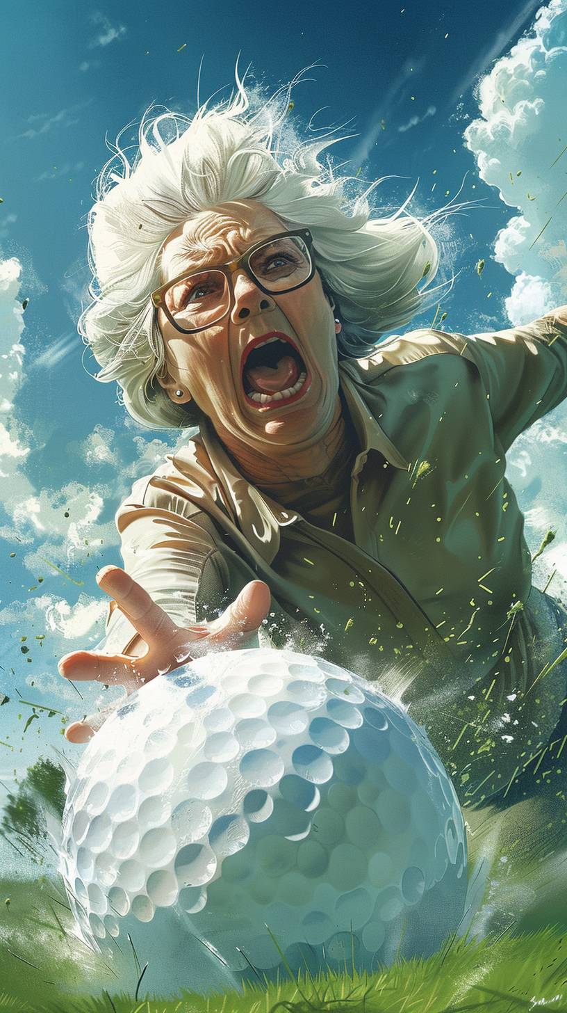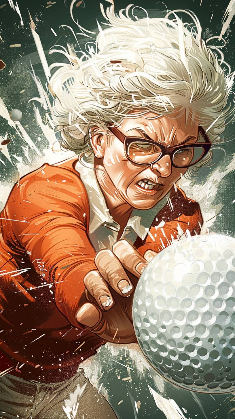 Una mujer mayor golpeando una gran pelota de golf con energía loca en una escena exagerada de estilo manga.