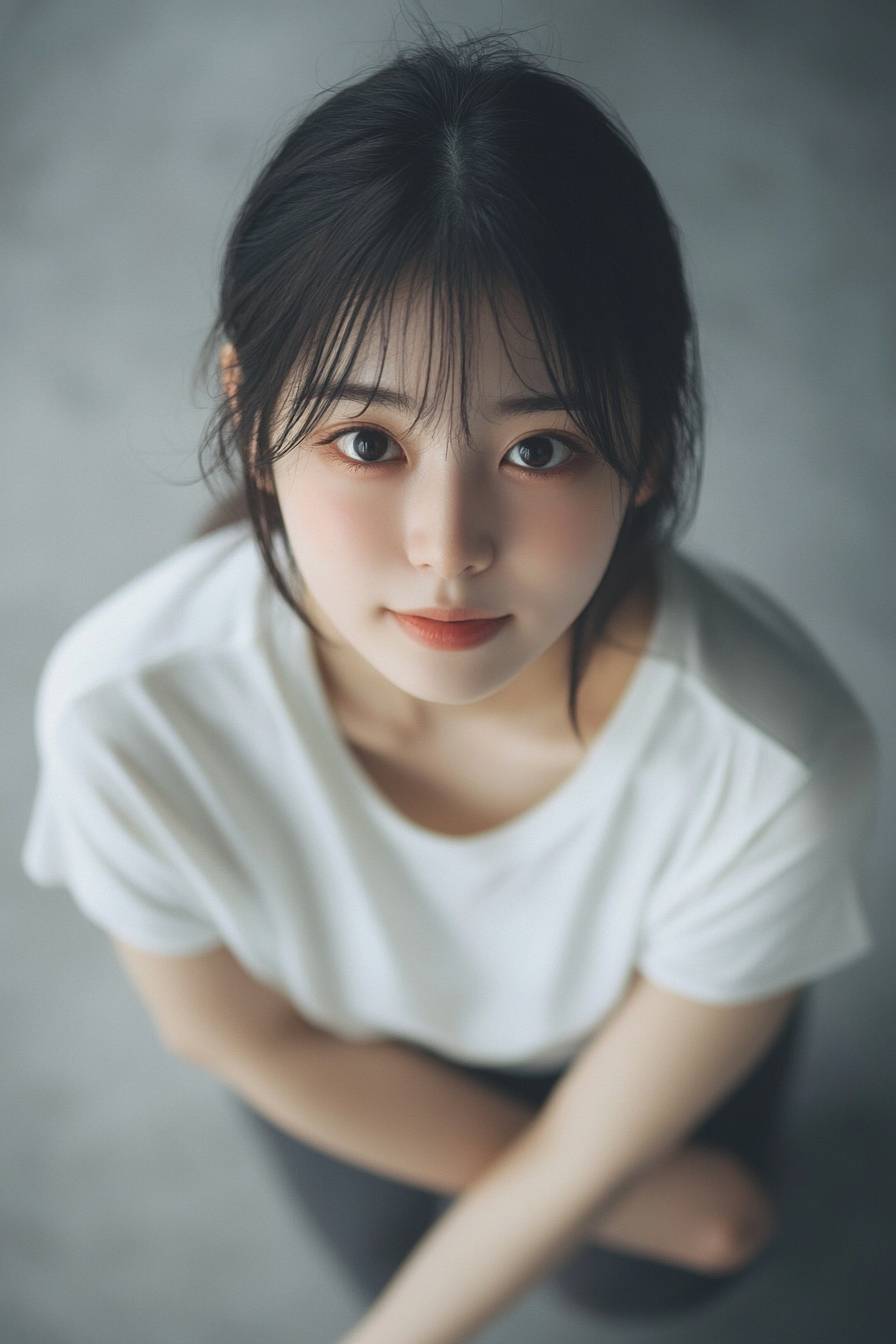 Un retrato de una linda chica japonesa mirando hacia abajo desde arriba. Su rostro tiene una sonrisa burlona. Lleva una camiseta blanca y tiene los brazos cruzados. Una toma larga de todo su cuerpo.