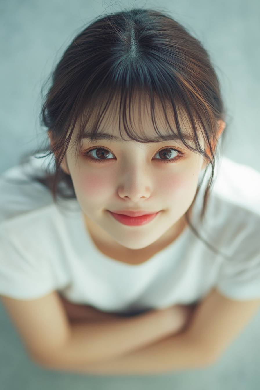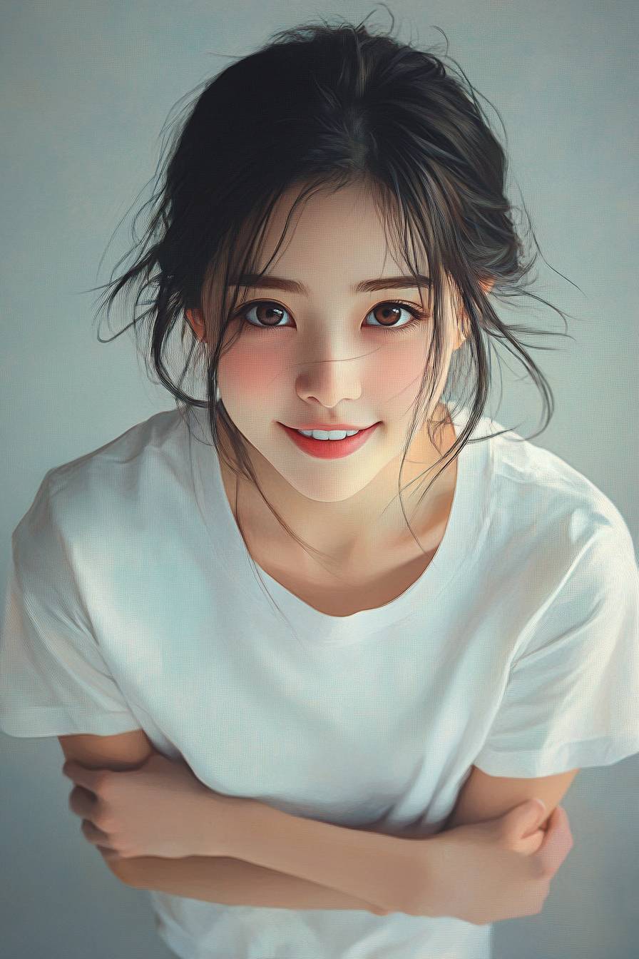 A portrait of a cute Japanese girl looking down from above. Her face is a smirking smile. She is wearing a white T-shirt. Her arms are crossed. A long shot of her whole body. --ar 2:3