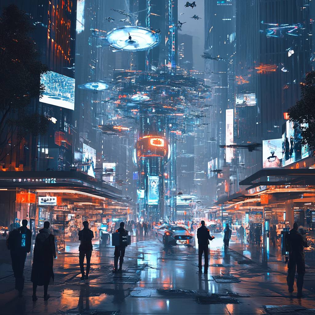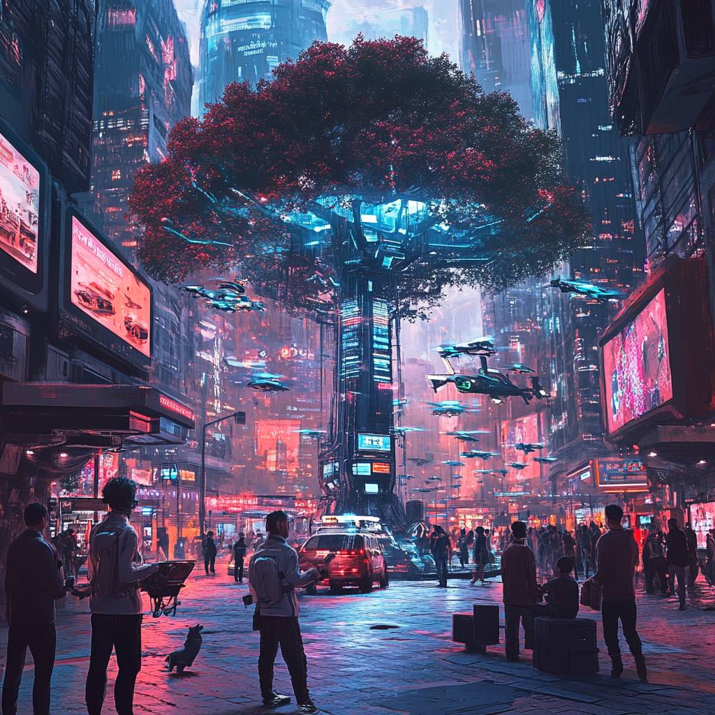 Un grupo diverso de personas interactuando con tecnología de inteligencia artificial, vehículos automatizados deslizándose y drones entregando paquetes. Estilo futurista de ciberpunk, al aire libre en un paisaje urbano bullicioso al atardecer, con calles bordeadas de rascacielos modernos y un mercado vibrante cercano. La iluminación consiste en neón con el suave resplandor de pantallas digitales y patrones intrincados de pantallas LED, en colores azul eléctrico y rojo ardiente, creando un ambiente energético. La composición presenta un árbol digital gigante con pantallas en el centro, personas reunidas alrededor de quioscos interactivos en un lado, vehículos automatizados pasando por el otro lado, y anuncios holográficos flotando en el aire, resultando en una mezcla perfecta de sombras y luces en edificios de vidrio reflectante.