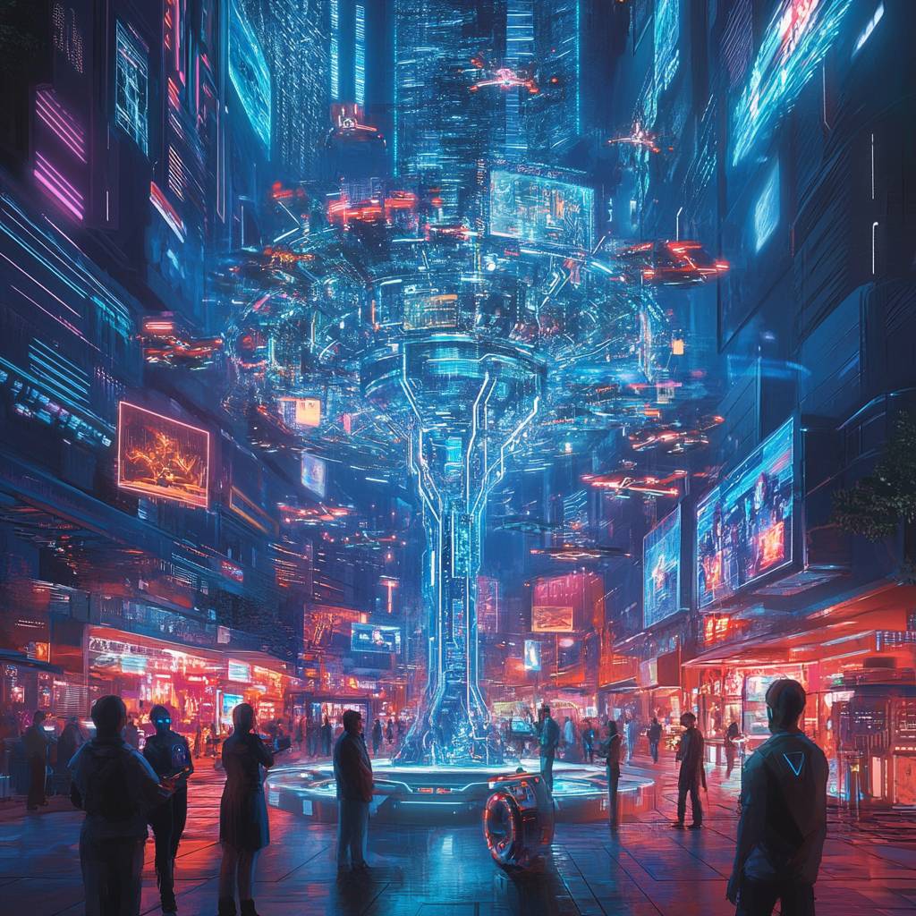 Subject(a diverse group of people interacting with AI technology, automated vehicles gliding by, drones delivering packages),Medium(Futuristic Cyberpunk style),Environment(outdoors, a bustling cityscape at twilight, streets lined with modern skyscrapers, a vibrant market nearby),Lighting(neon, the soft glow of digital screens, intricate patterns of LED displays),Color(electric blue, fiery red),Mood(energetic),Composition(a towering digital tree with screens in the center, people gathered around interactive kiosks on one side, automated vehicles passing by on the other side, holographic advertisements hovering in the air, a seamless blend of shadows and highlights across reflective glass buildings)