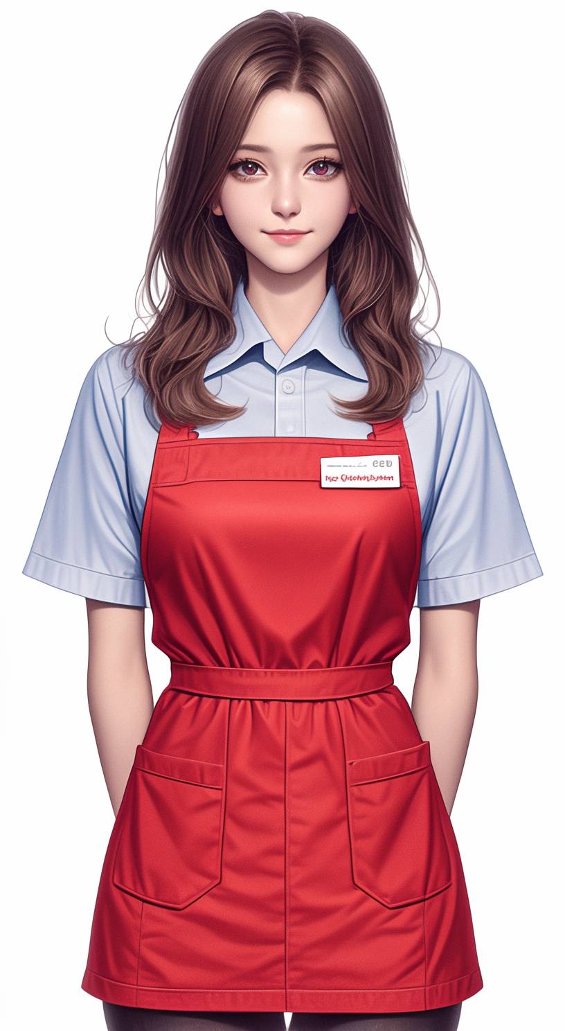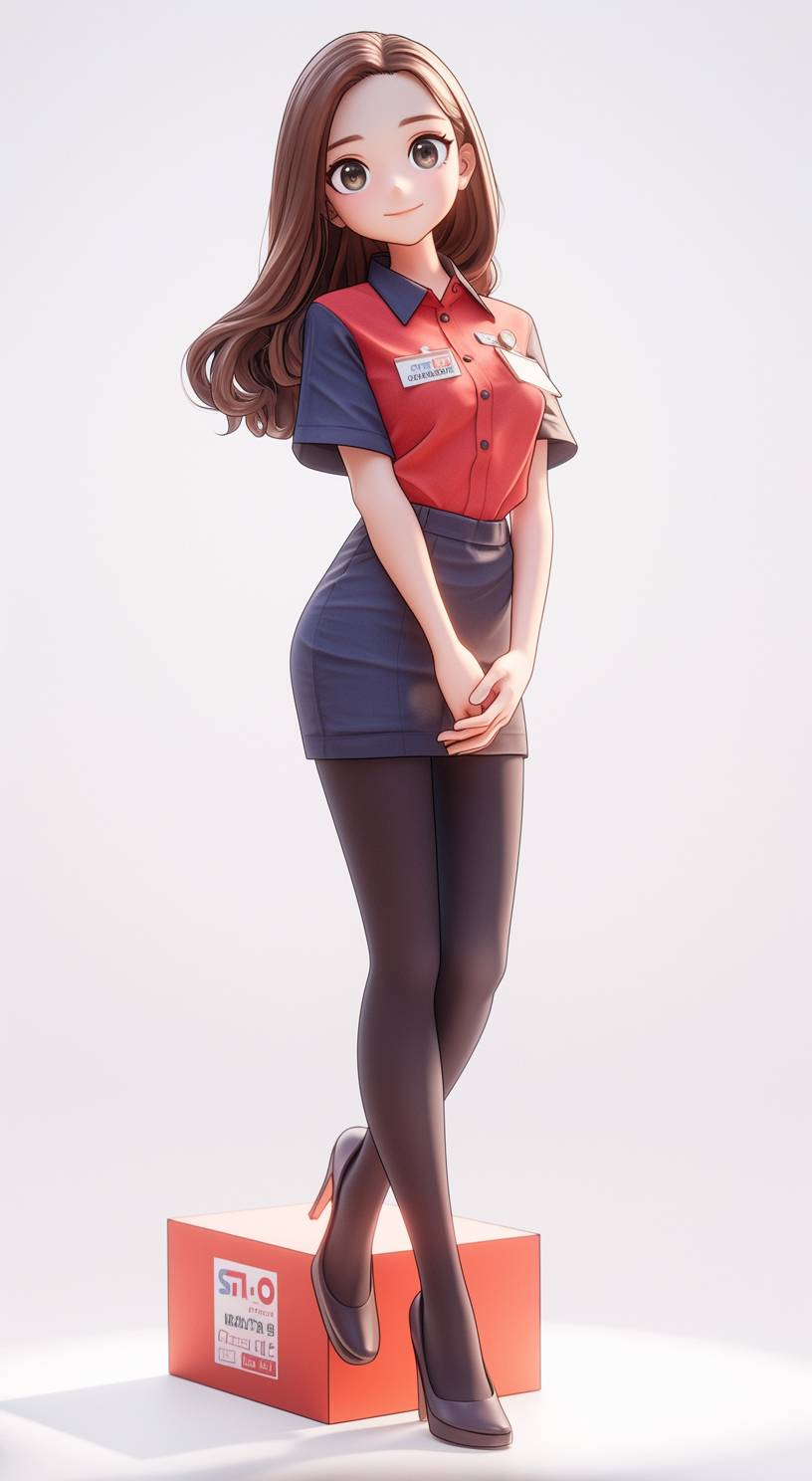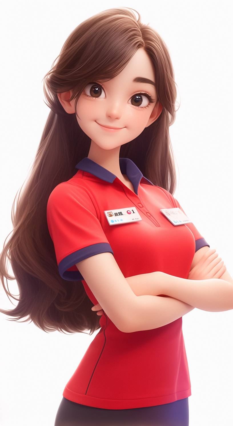 Female employee of mass merchandise store, waitress at the cashier, neatly combed hair, friendly and elegant smile, smiling at the camera, front view, red and blue and white uniforms, young and beautiful, white background,. High resolution, blind box 3D ip design, empty background, chibi, blind box, clay material, pastel colors, studio lighting, octane rendering, ultra quality, ultra high definition, Pixar, IP, 3D, C4D, Blender, 8K --ar 17:31 --stylize 400 --niji 6