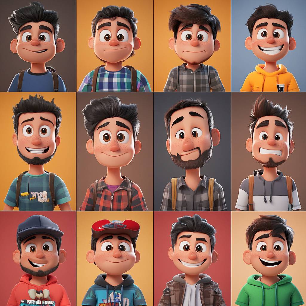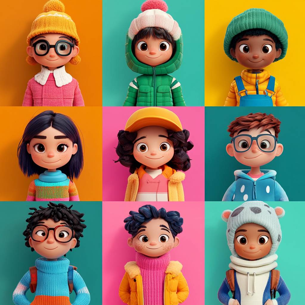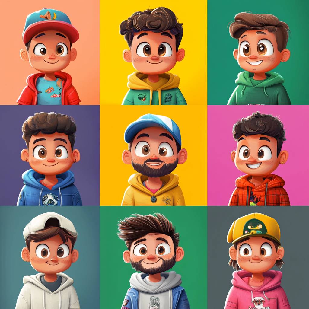 NFT collection, [Adjective] cartoon [Subject] with different colors, clothing, and expressions, close up, grid collection --style raw