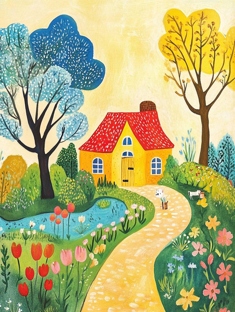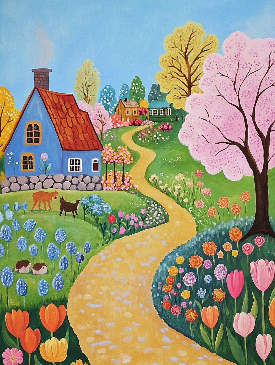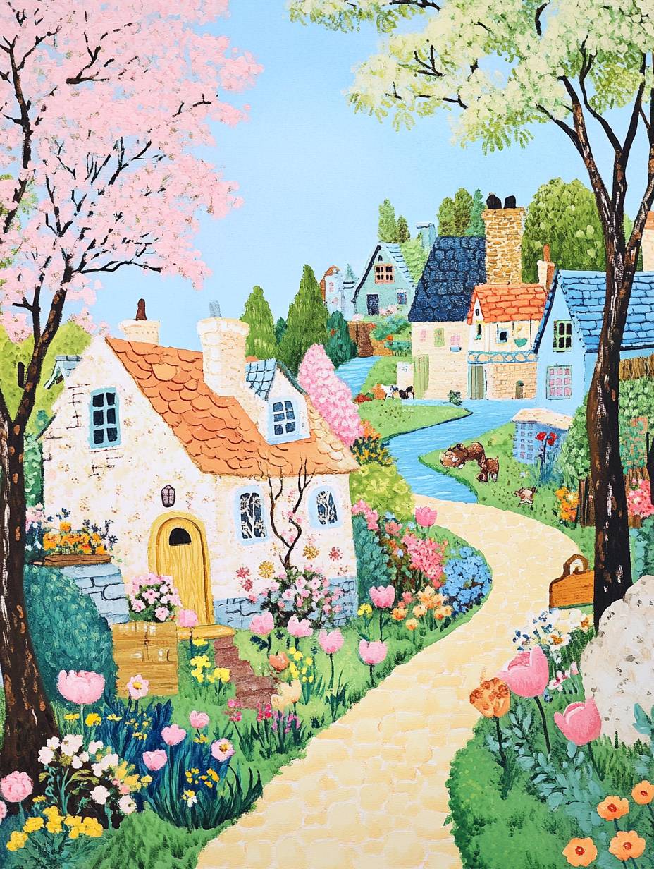 A corner of Storybrooke in spring, children's book illustrations by Erich Heinemann and Magnus Weightman, naive art, painting on pale yellow colored paper, blooming trees, Cobblestone roads, Cute Colorful Stone Little House, blue sky, Giant tulips, giant yummies, giant roses, small wildflowers, a blue river, Green grass and small animals, Comfort and farm life atmosphere, clean lines, delicate details, full color, watercolor, fresh and soft colors, --ar 3:4 --style raw --v 6.1
