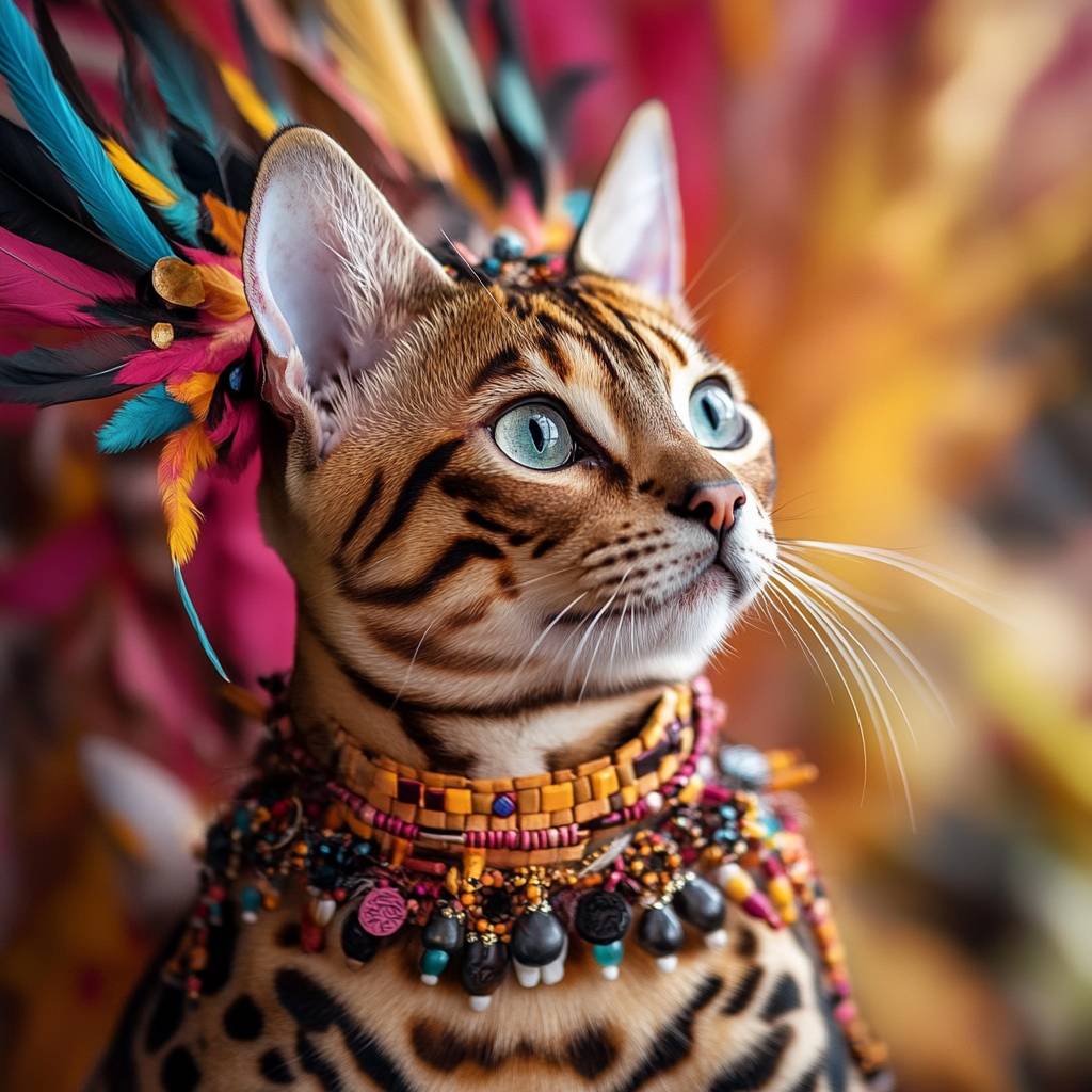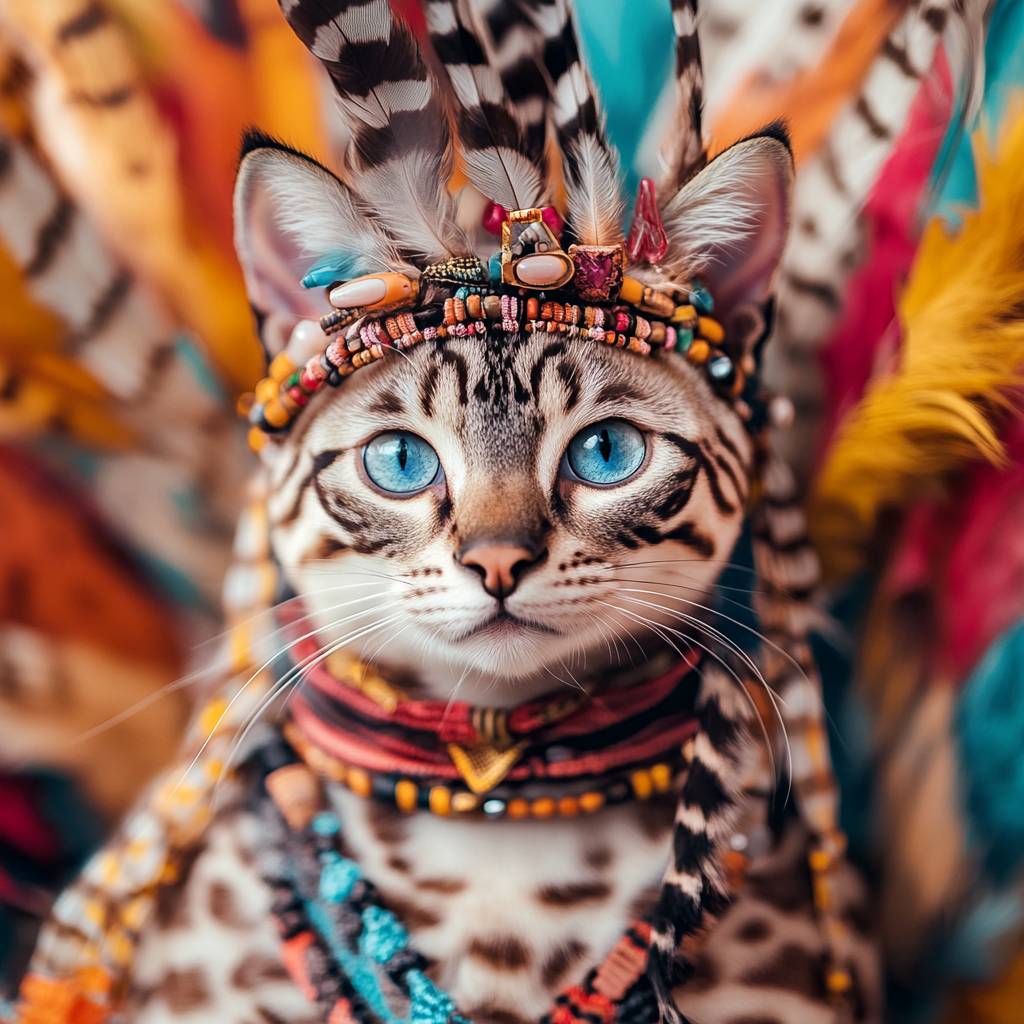 A native Warrior shaman Bengal Cat with a black and white leopard pattern, blue eyes, short fur, and portrait pose, colourful feathers and colourful ornaments, in style of cute pet photography, in the style of cute pet photo style, a real shot, high-definition photography, high resolution, native attire, and native ornaments, a portrait of the queen of native shaman white Cat with wings and headdress. nordic is kind and motherly, it has black eye makeup and her hair is in messy braids, very detailed, 16K, style, it is staring at the front, cute eyes. jewels decoration, psychedelic background,, background full of abstract colourful images,--ar2:3 --v 6.1 --personalize ws9ntij