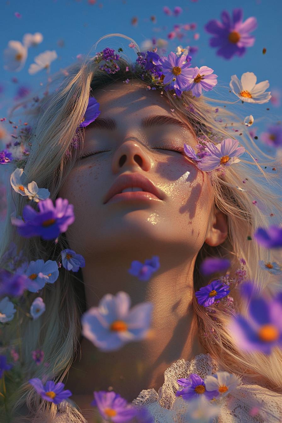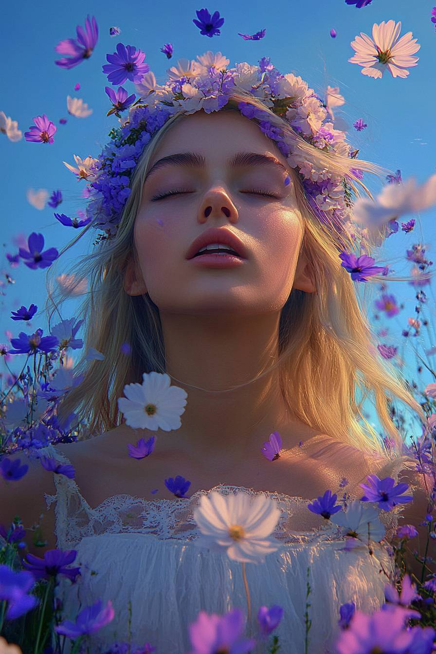 Editorial de moda, estilo Vogue, toma espontánea, una foto de una modelo rubia rodeada de pétalos voladores, vistiendo un vestido blanco y una corona hecha de flores blancas y moradas, maquillaje delicado, ambientada en un campo de flores, flores en plena floración, cielo azul claro, luz natural, alto contraste, evocando una atmósfera de ensueño.