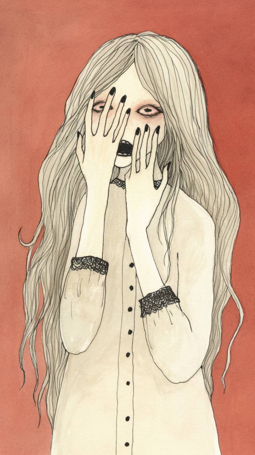 Dibujos a mano de una persona perturbada, trazos gruesos de colores, espeluznante.