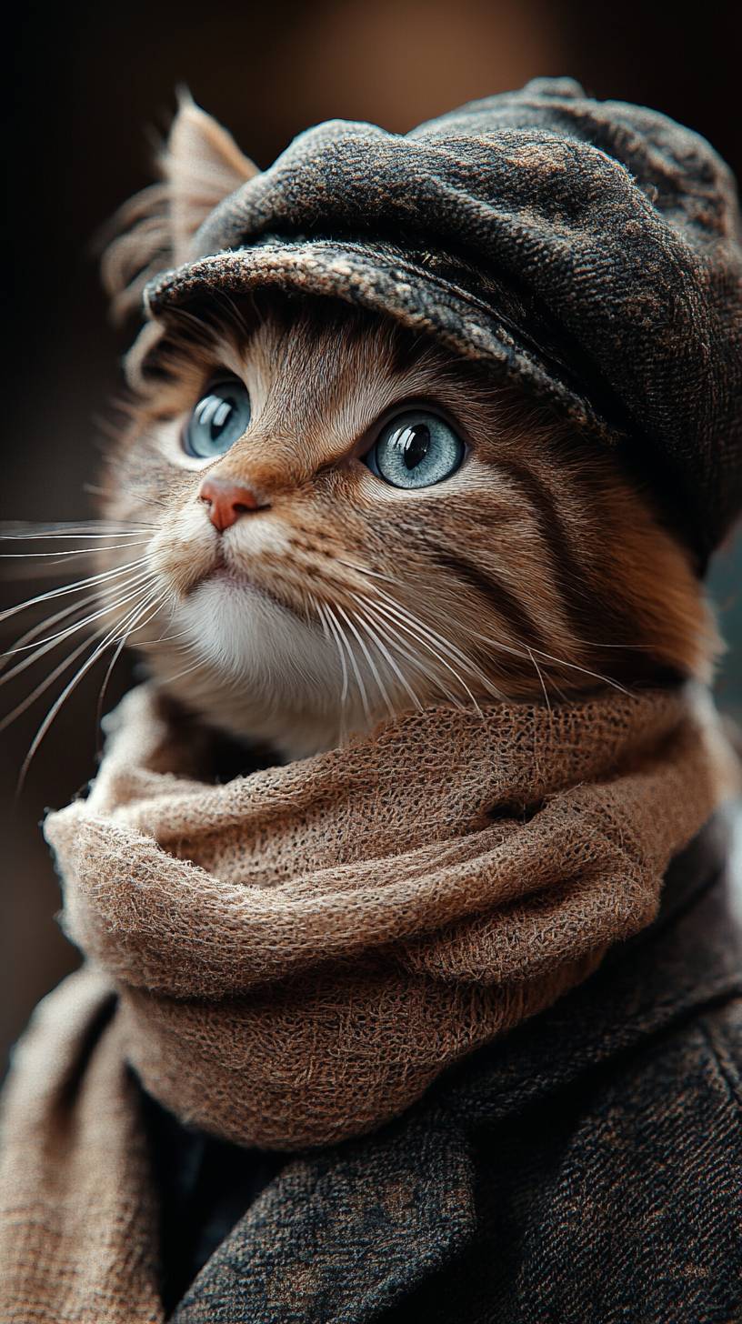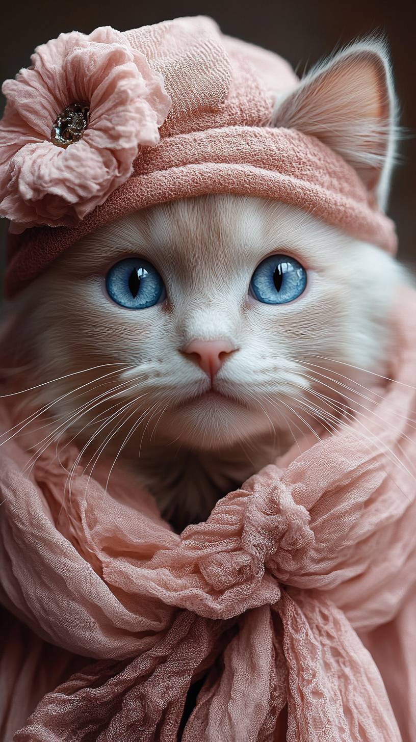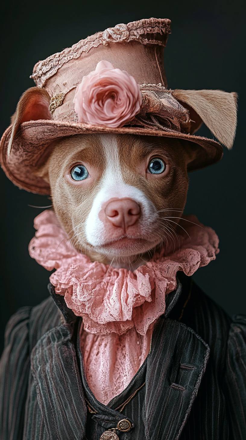 domestic animals dressed in Victorian clothing, caricatures, cute, pink background, close-up of the face in perspective, unusual scene, realistic photo, big blue eyes, --ar 9:16 --stylize 750 --v 6.1