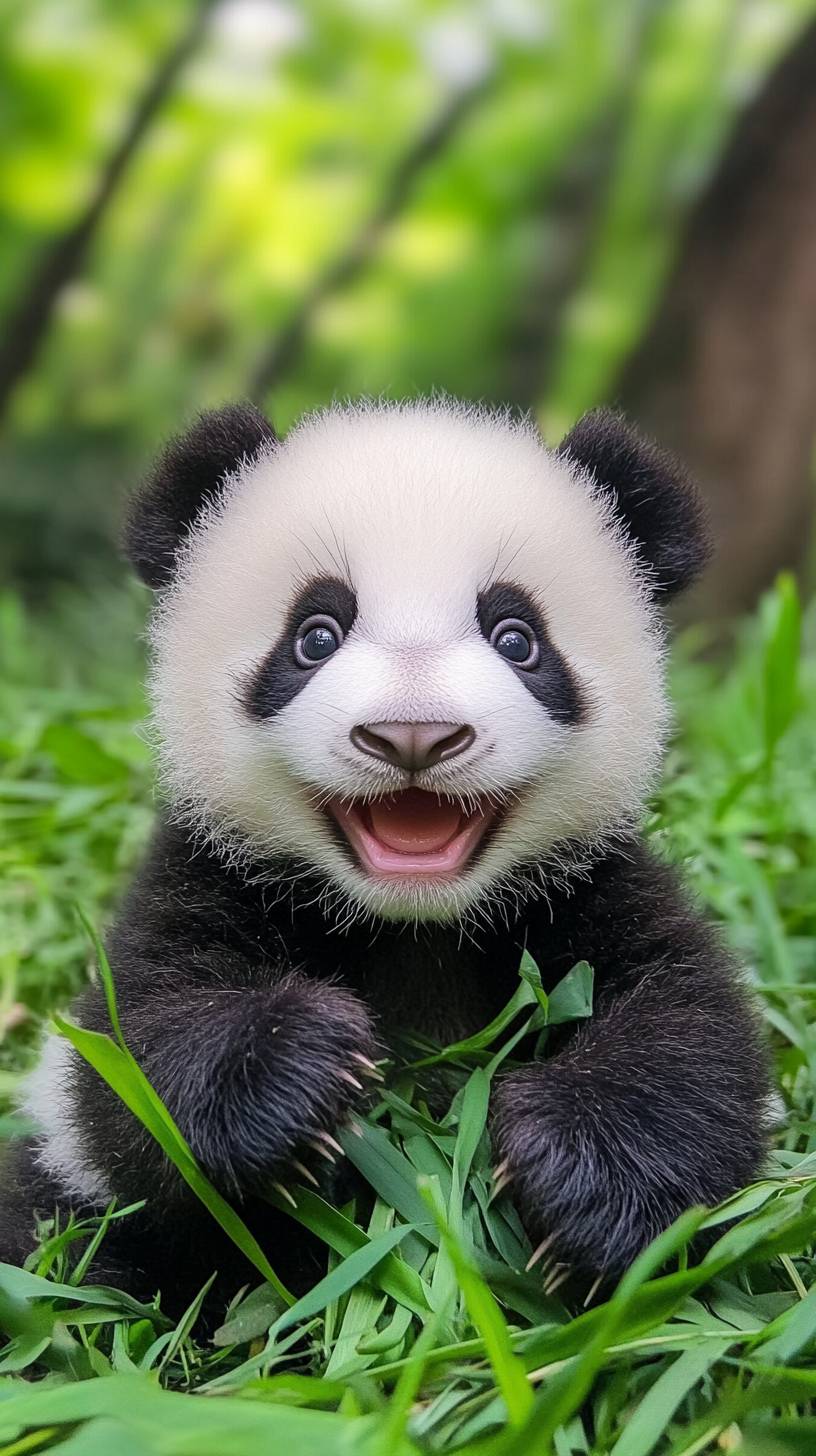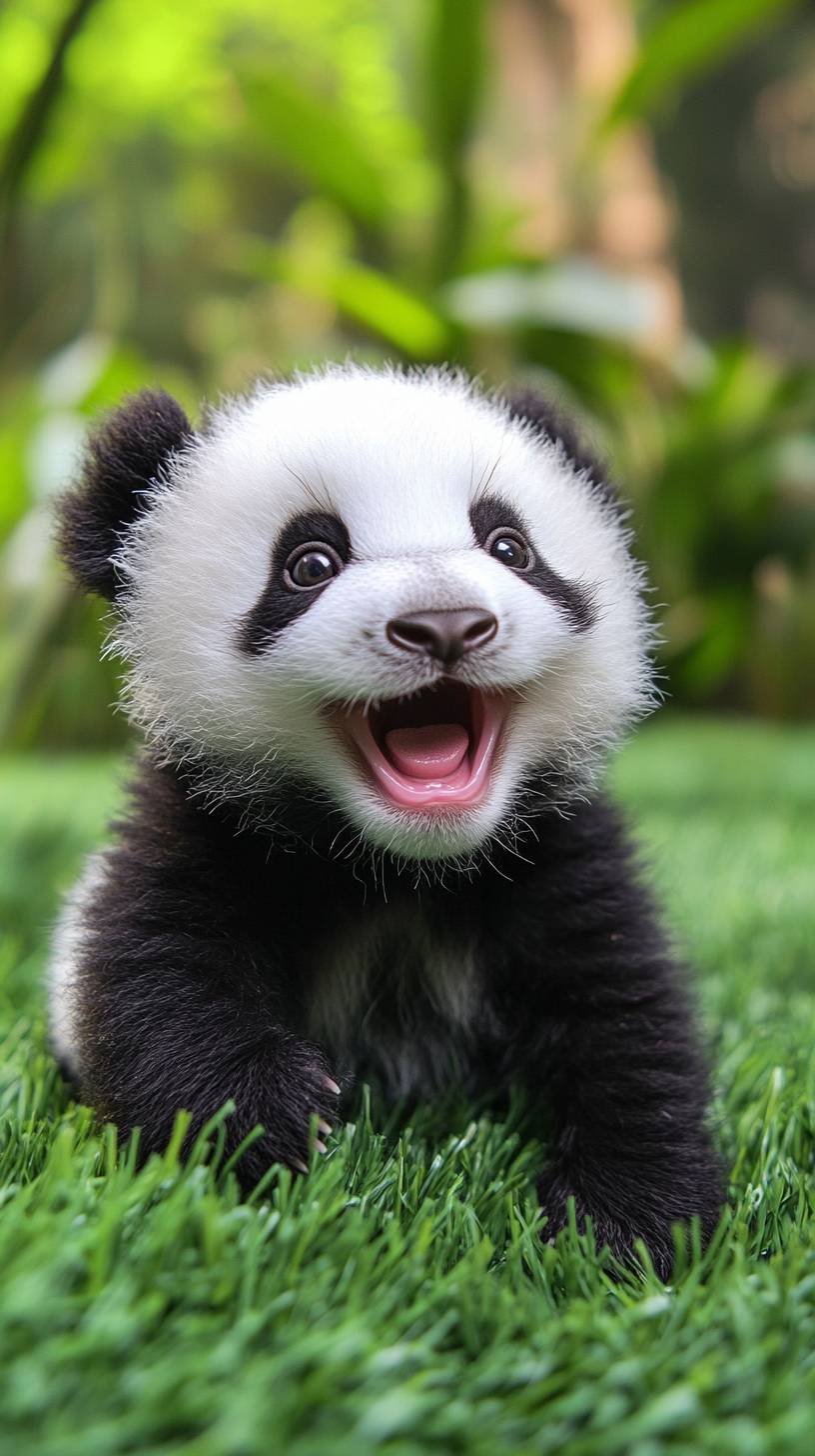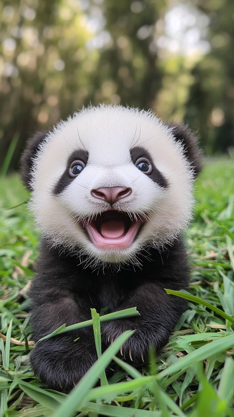 The world's smallest laughing [Baby panda],is undoubtedly cute and charming. The photo is very realistic and captures thesubtle features of the [tiny panda]with preciseprecision.Grass in the background.Big eyes --ar 9:16 --style raw --v 6.1