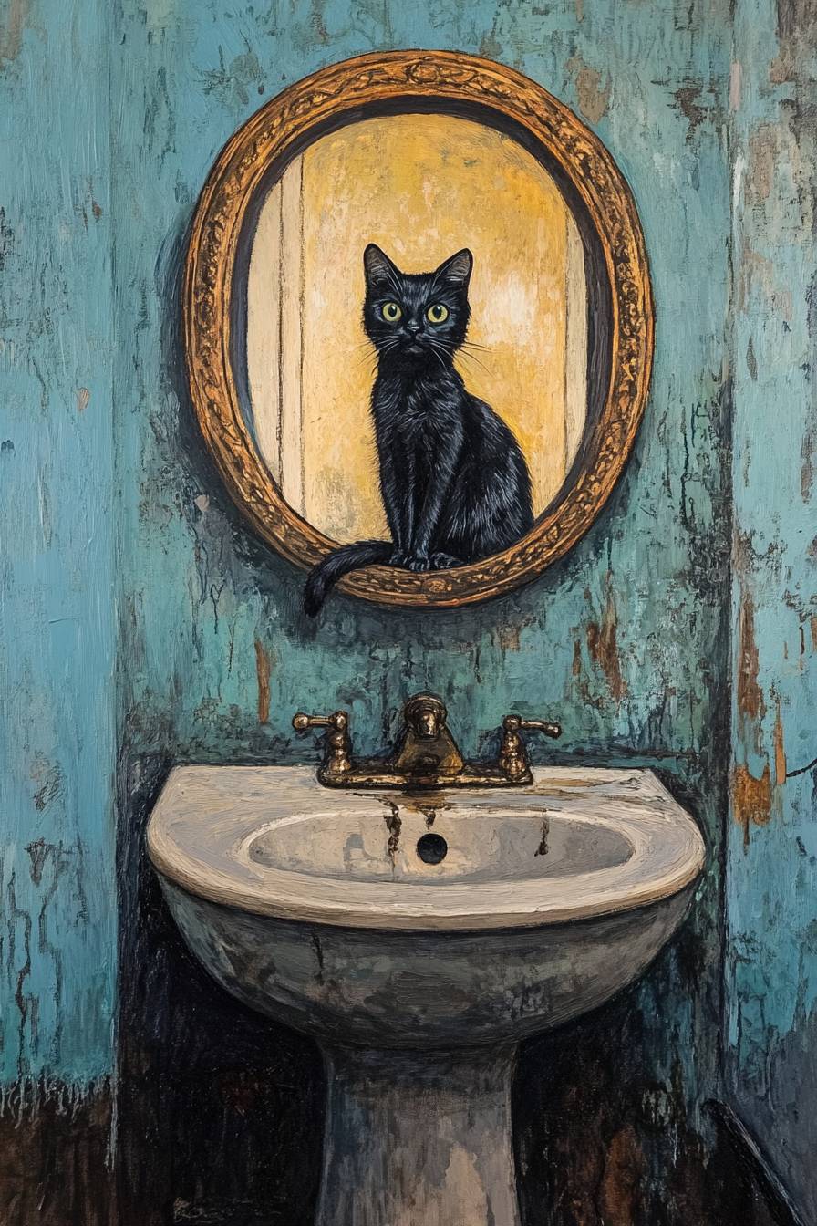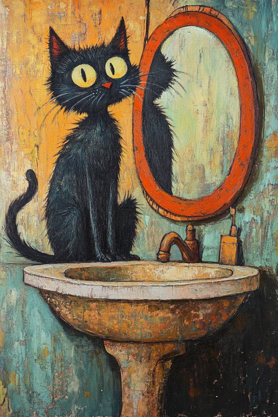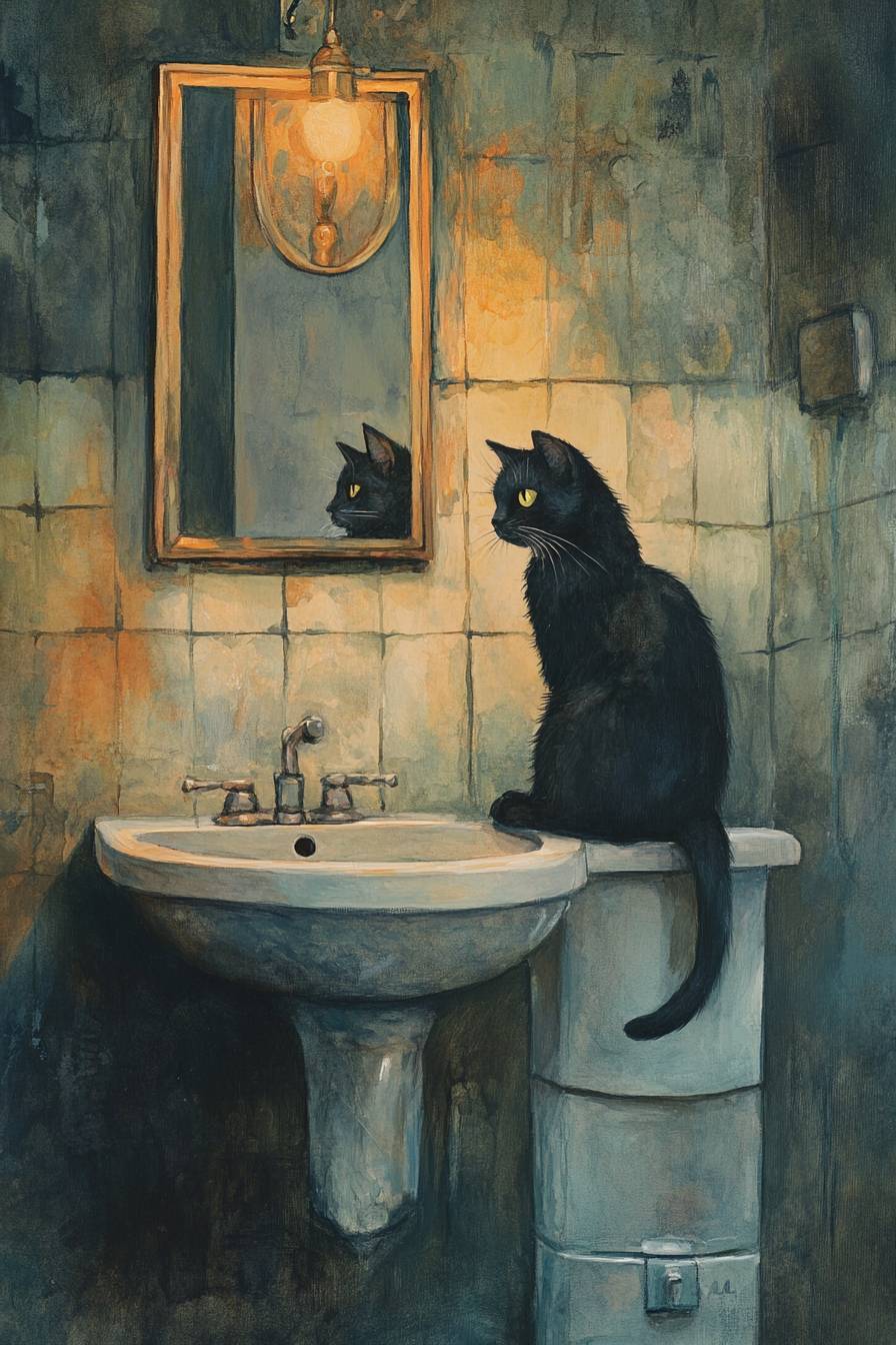 Gato negro sentado en el baño mirándose en el espejo