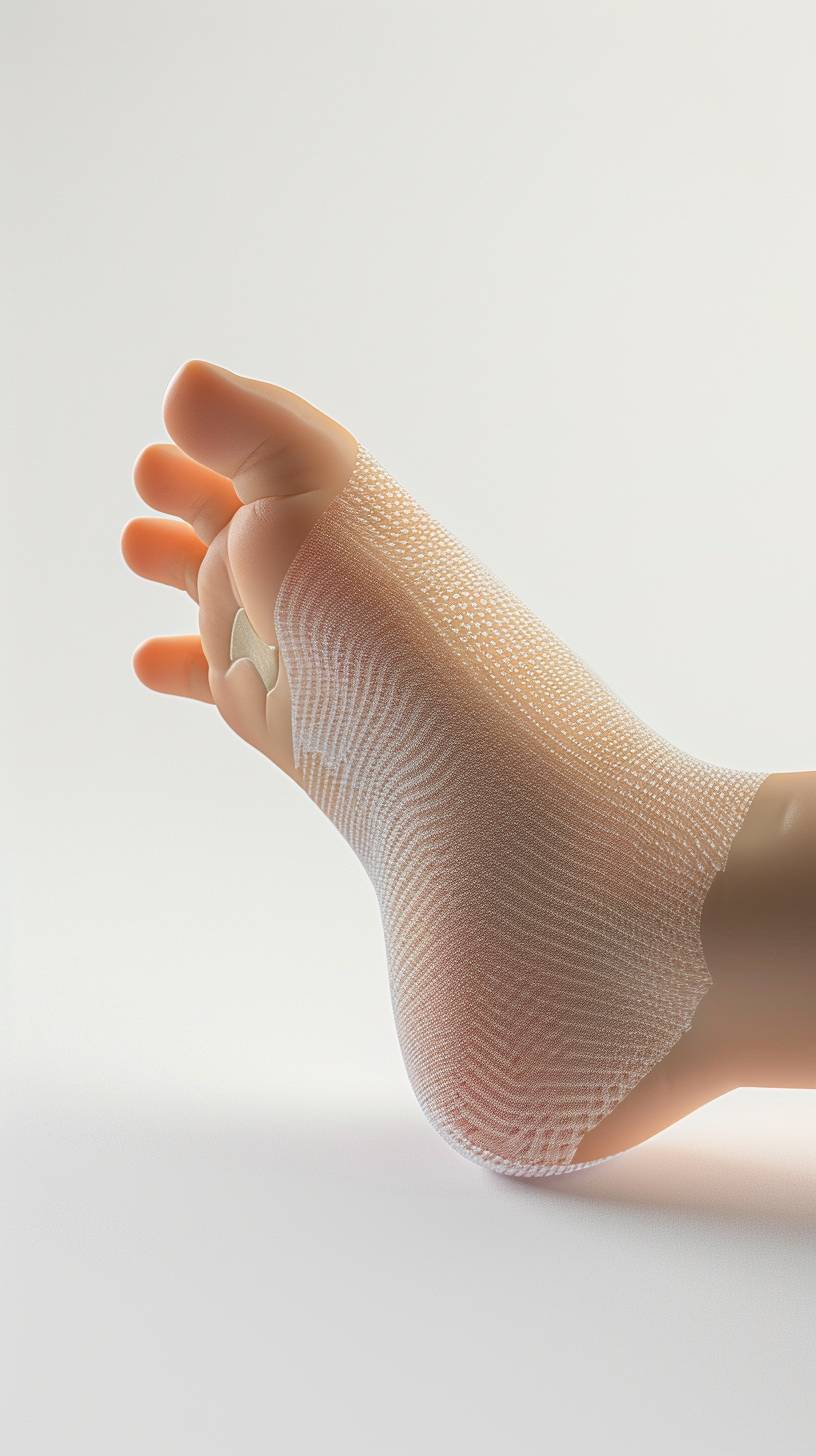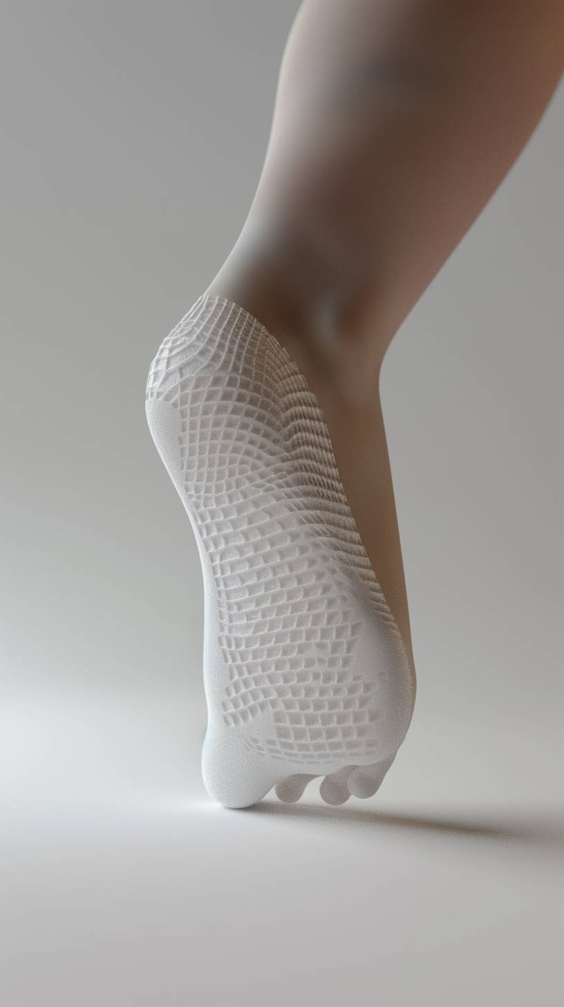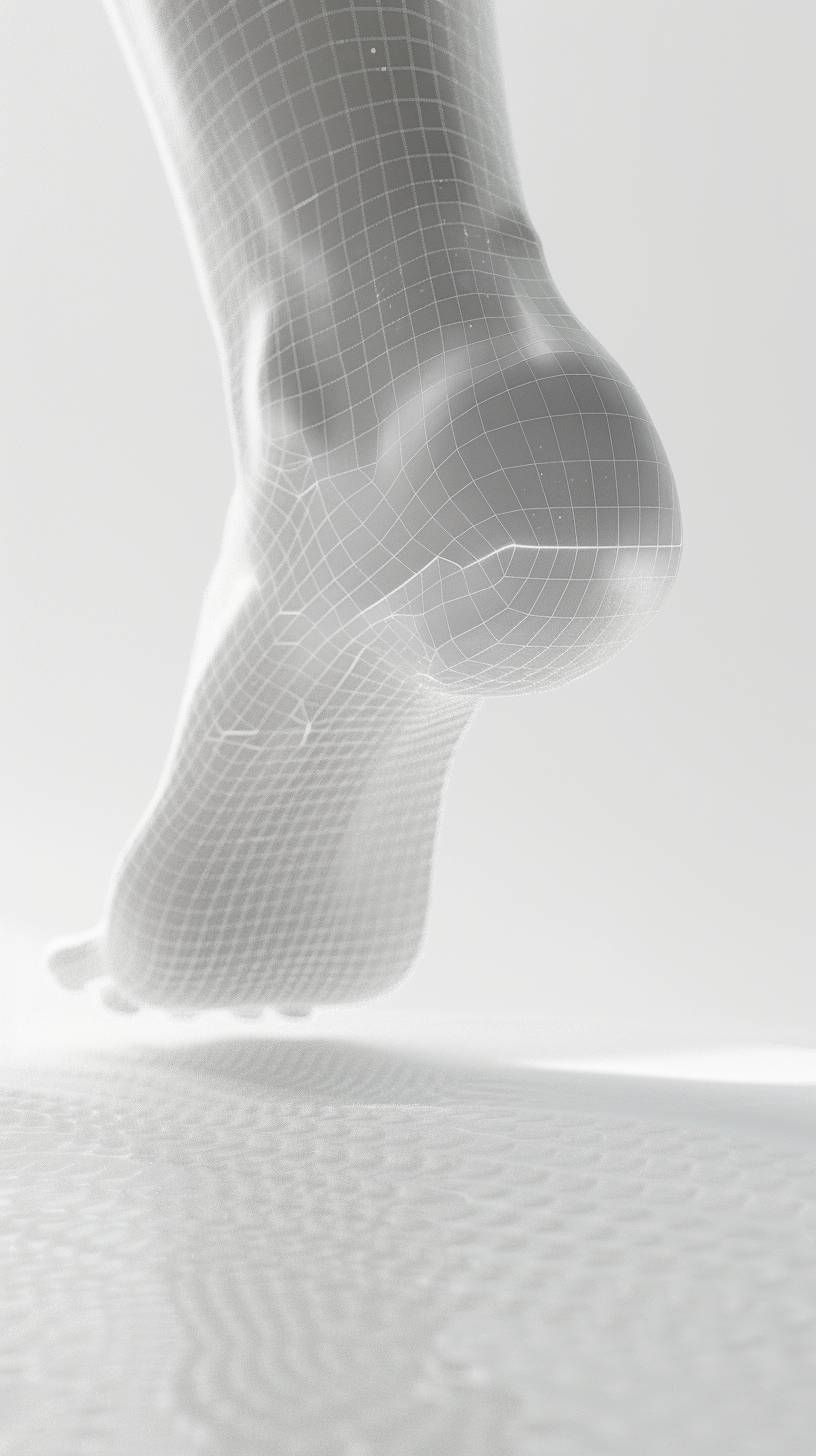 A 3D render of a child's foot, visible mesh model, slightly visible from underneath, on a white background. Under the foot, an orthopedic insole. Realistic lighting, hd quality, white mesh, vivid style --ar 9:16 --v 6.0