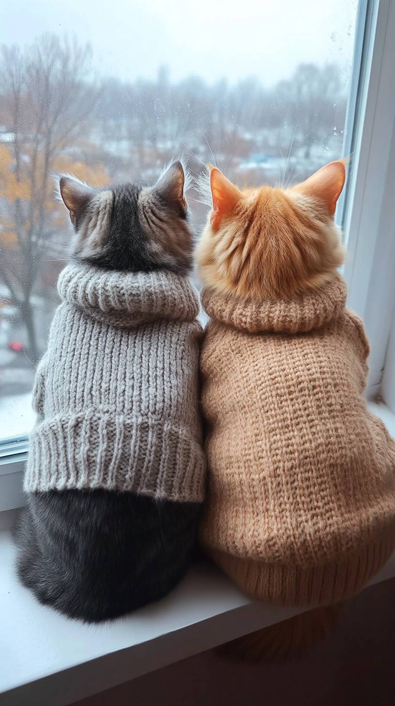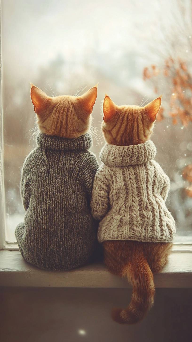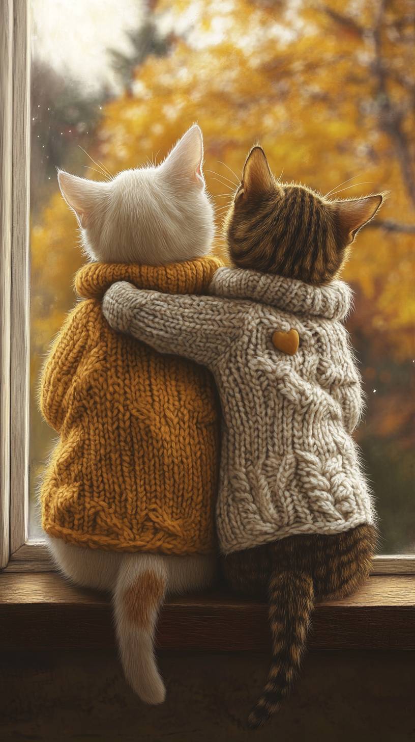 Pair of cats in knitted sweaters sitting on windowsill, cuddled, ! paw on shoulder! Back view, foto realista, 🍂 cute, looking away, interconnected, pair of friends, both dressed, petspective room layout, by Robert Koehler, trending on Pinterest, fall --ar 9:16 --v 6.1