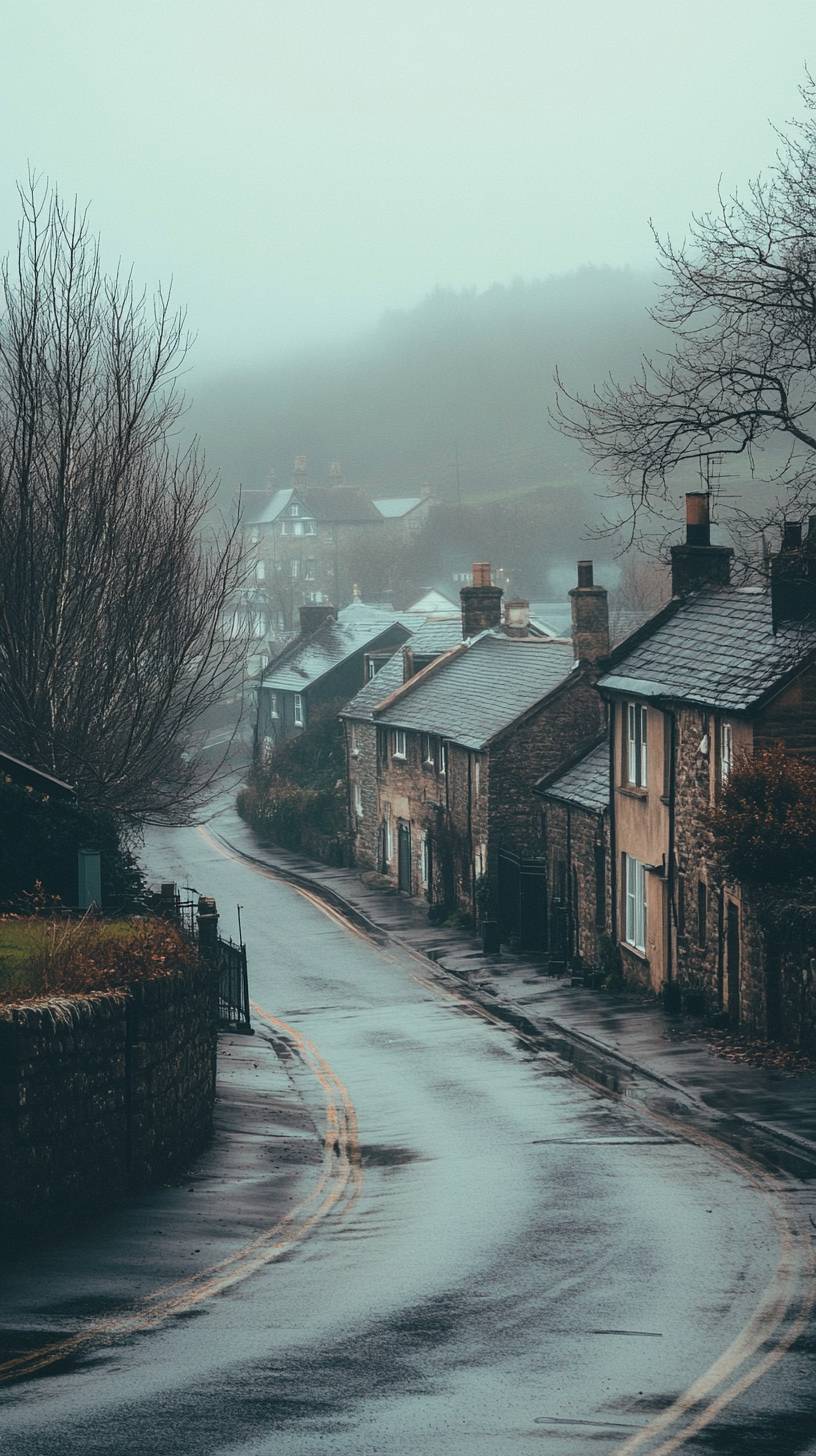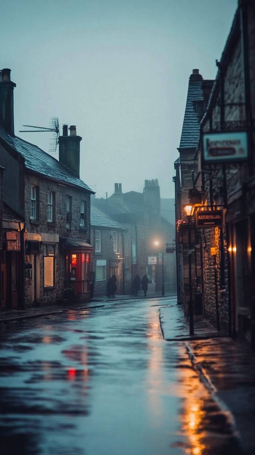 Ambiente de thriller en un pequeño pueblo del norte del Reino Unido con niebla