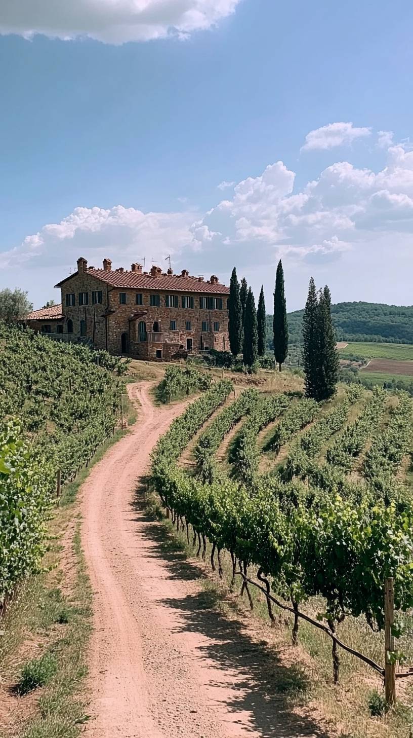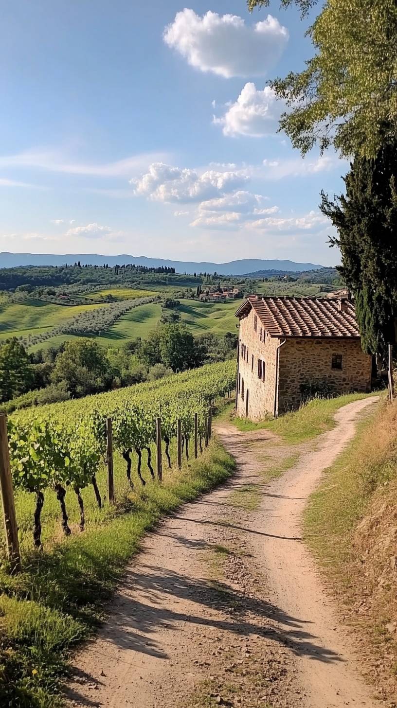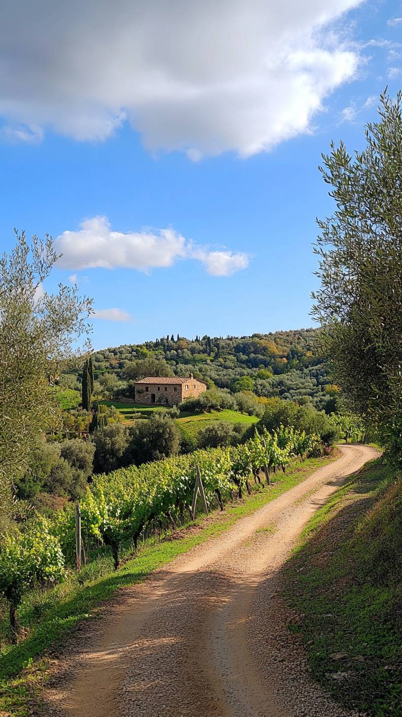 4K ultra-realistic Tuscany landscape, rolling hills covered in vibrant green vineyards and olive groves, a winding dirt path leading to a rustic stone farmhouse with terracotta roof, soft blue sky with a few fluffy clouds, photo taken with Canon EOS R5, RF 24-70mm f/2.8L lens --ar 9:16 --style raw --v 6.1