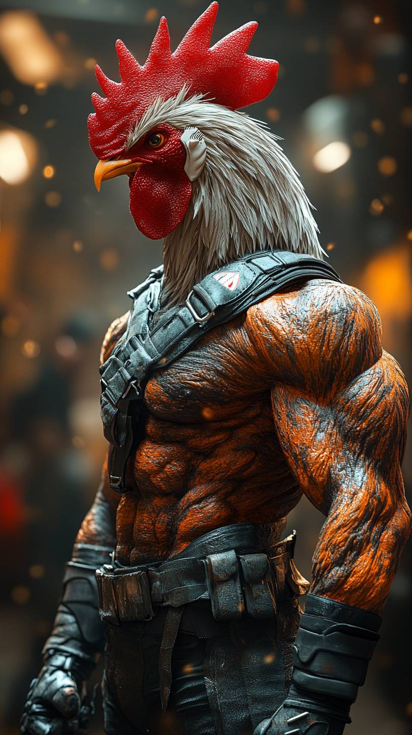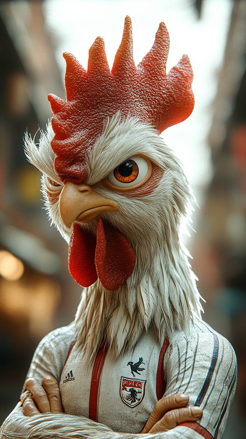 full-body shot of a muscular and rooster hybrid with a FC tottenham sports uniform and the head of the rooster. The blend between the human and rooster parts is smooth, the background is a BIG Stadion, UHD, 4K --chaos 20 --ar 9:16 --stylize 750 --v 6.1