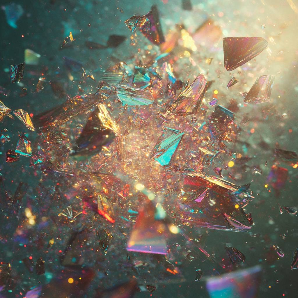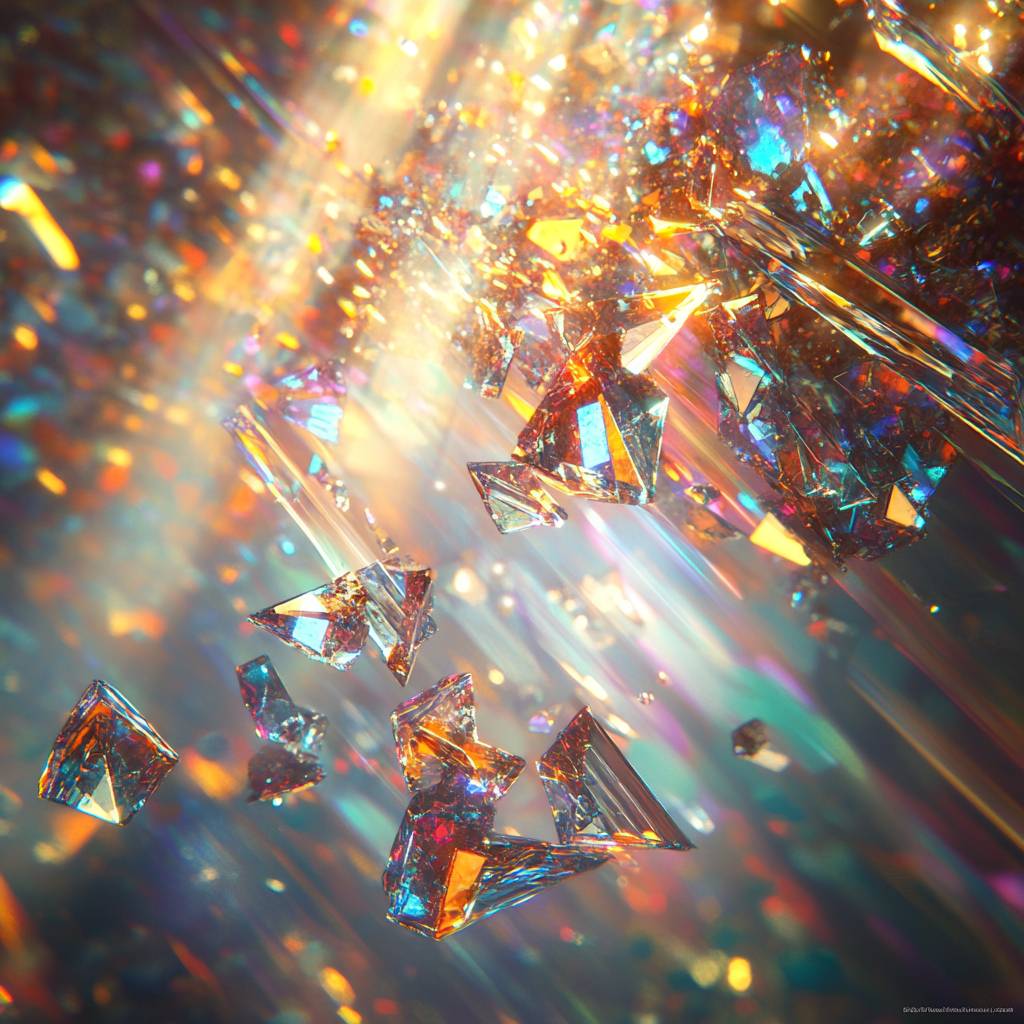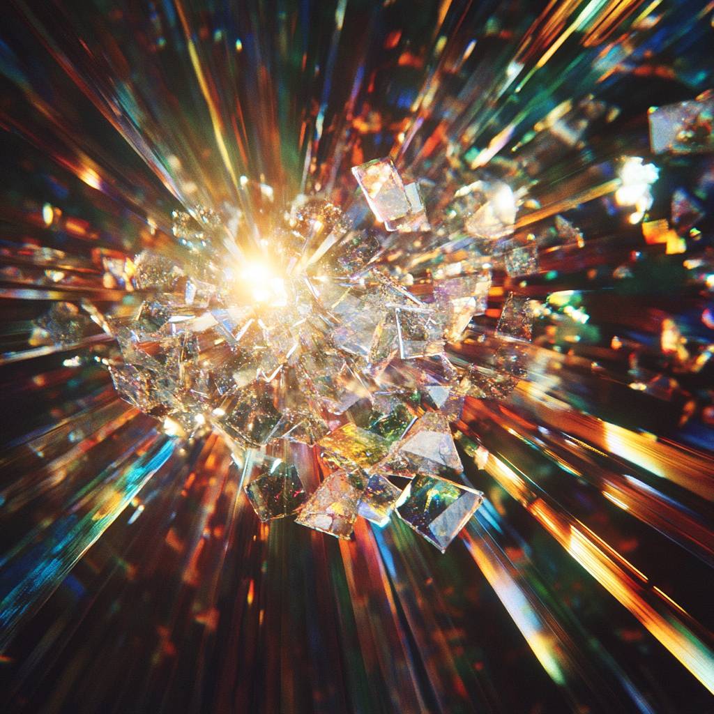 Rompiendo en una fractalización de luz prismática, donde la luz se divide en innumerables prismas de partículas. Usando haces de luz [COLOR1] que se rompen en partículas cristalinas [COLOR2].