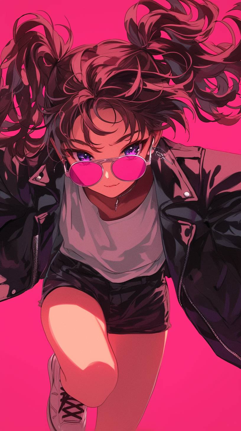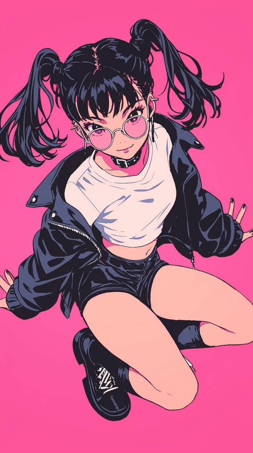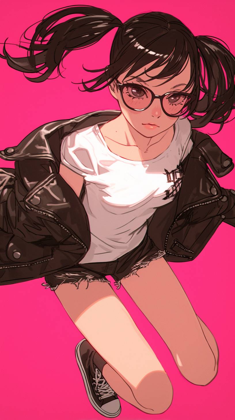Anime illustration of a cute young girl with pigtails and sunglasses, Top-down view, wearing a white t-shirt and black leather jacket and black shorts. She is jumping in a cool pose, against a pink background, in the style of Masamune Shirow, a Japanese fashion artist. --ar 9:16 --niji 6