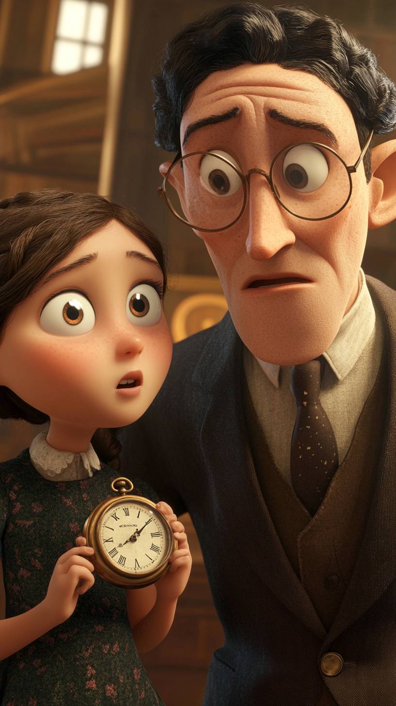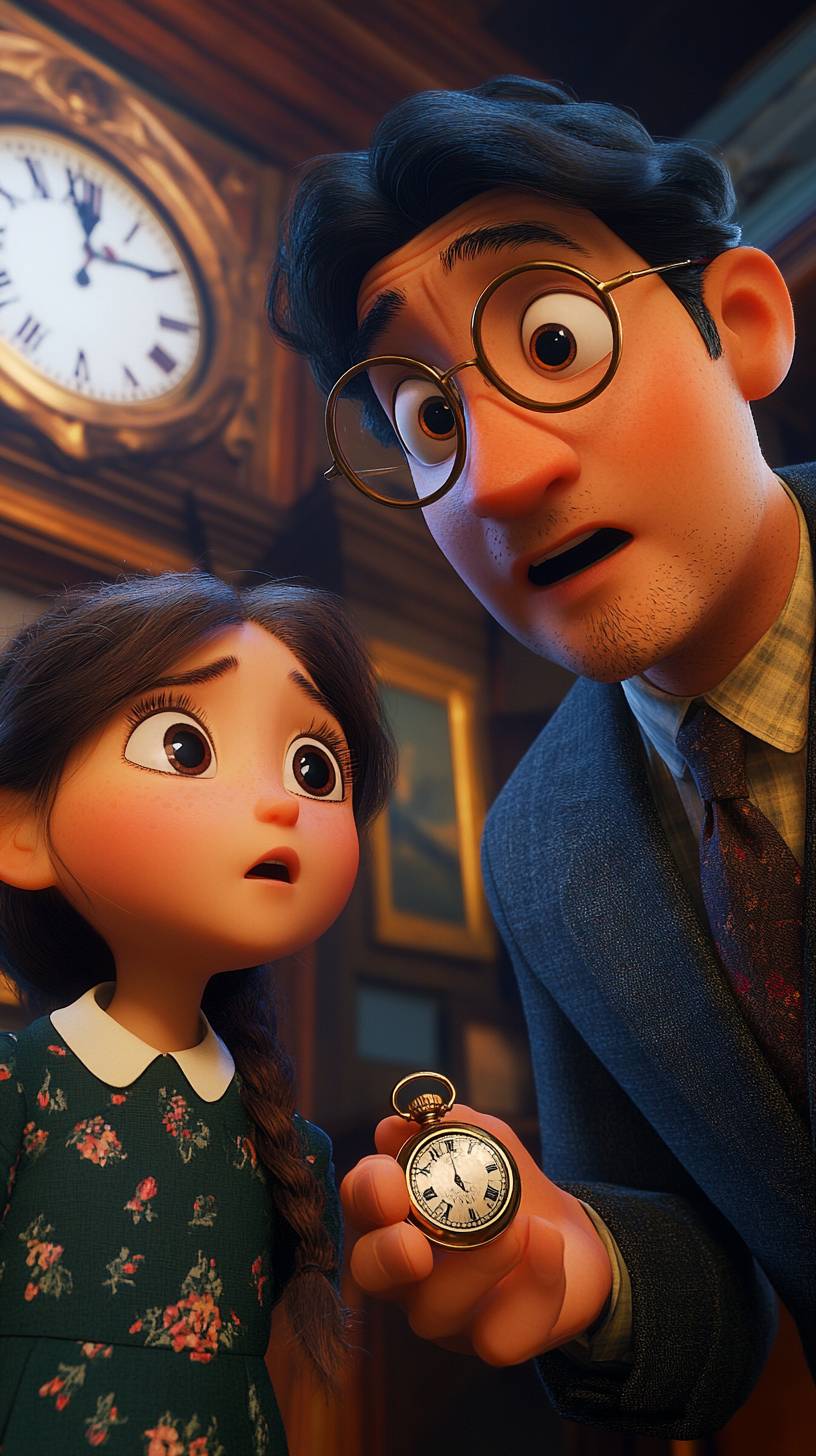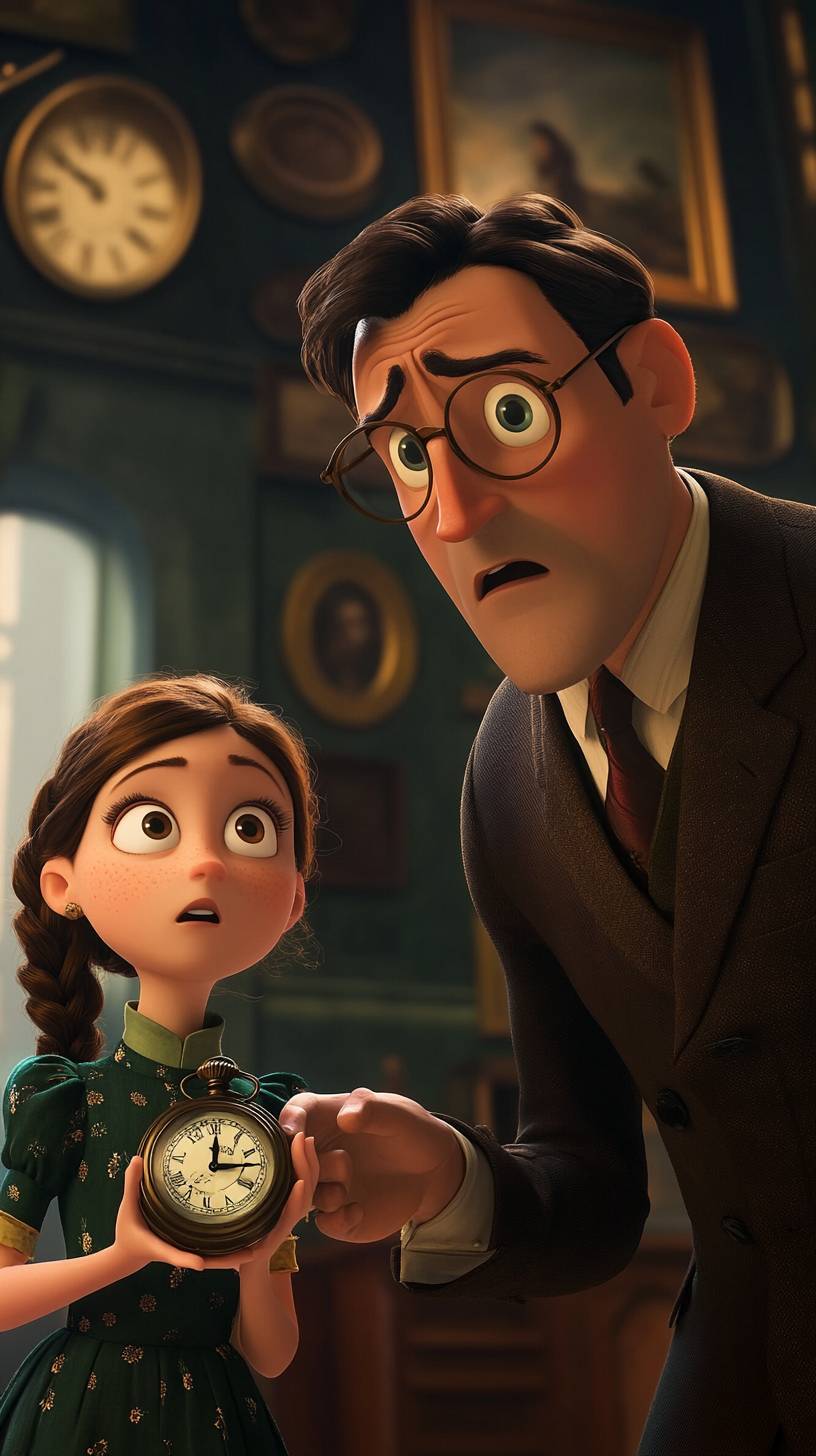 Create a Disney Pixar style close-up shot of a museum curator with round glasses and a suit, looking intently at the pocket watch with a shocked expression. The young girl watches him closely, curious and hopeful. She wears a dark green dress with a small floral pattern and short sleeves. She has brown braided hair. The point of view is from the side, emphasizing the curator's amazement. The lighting is bright and focused. The mood of the scene is surprising. Ensure the background shows display cases and historical artifacts on the walls. --ar 9:16 --v 6.1