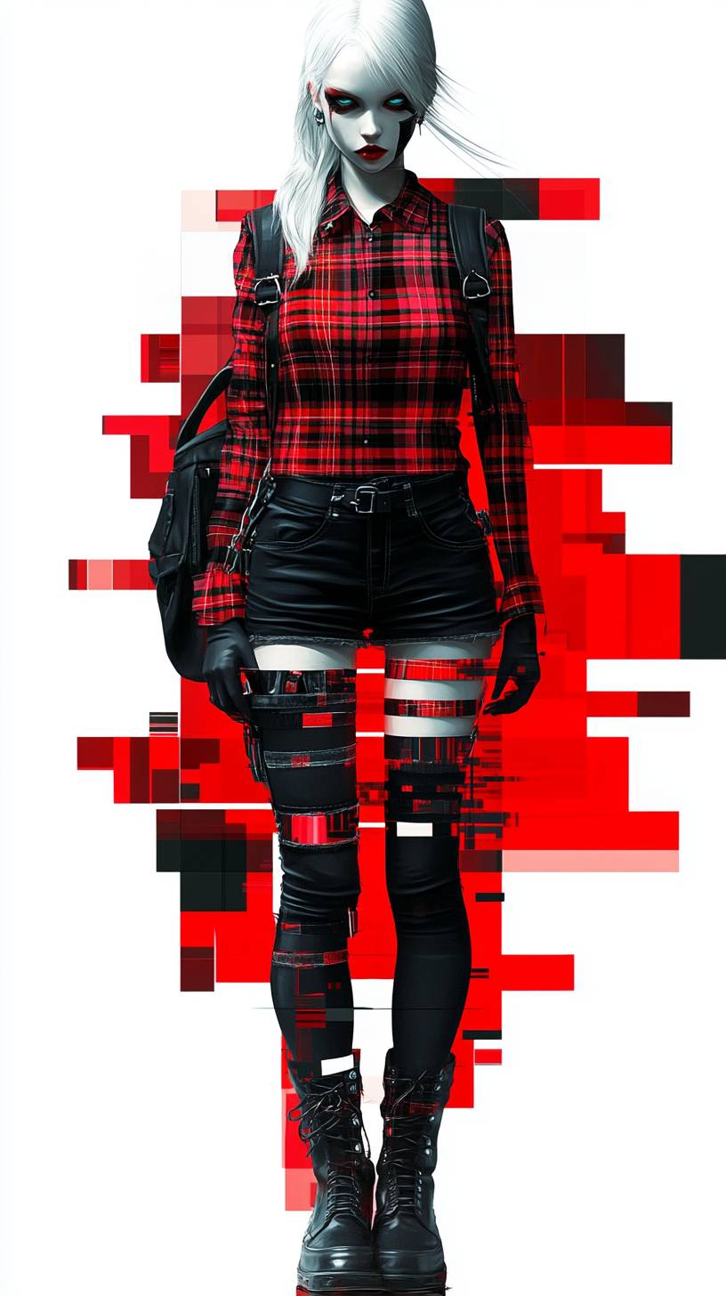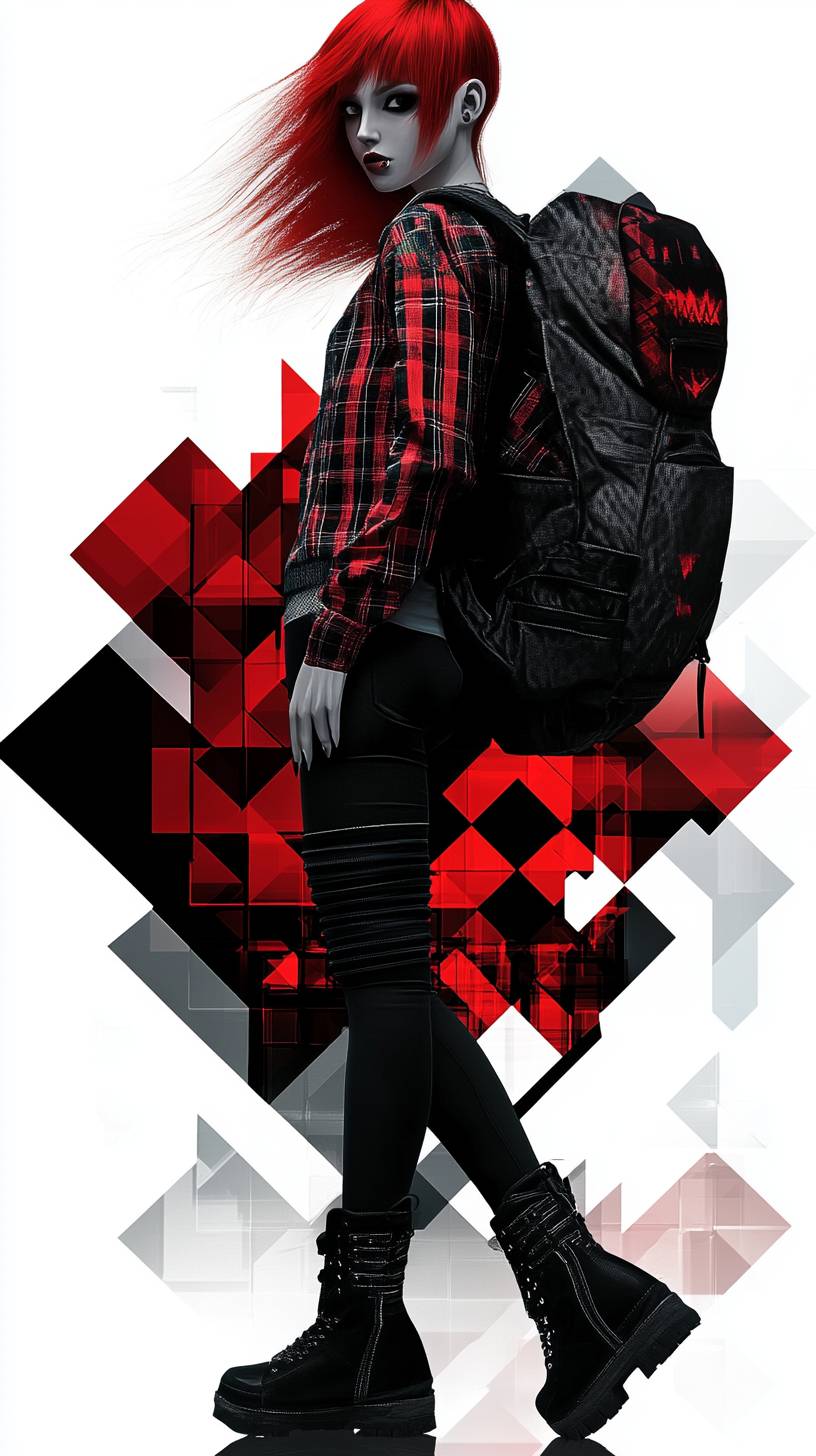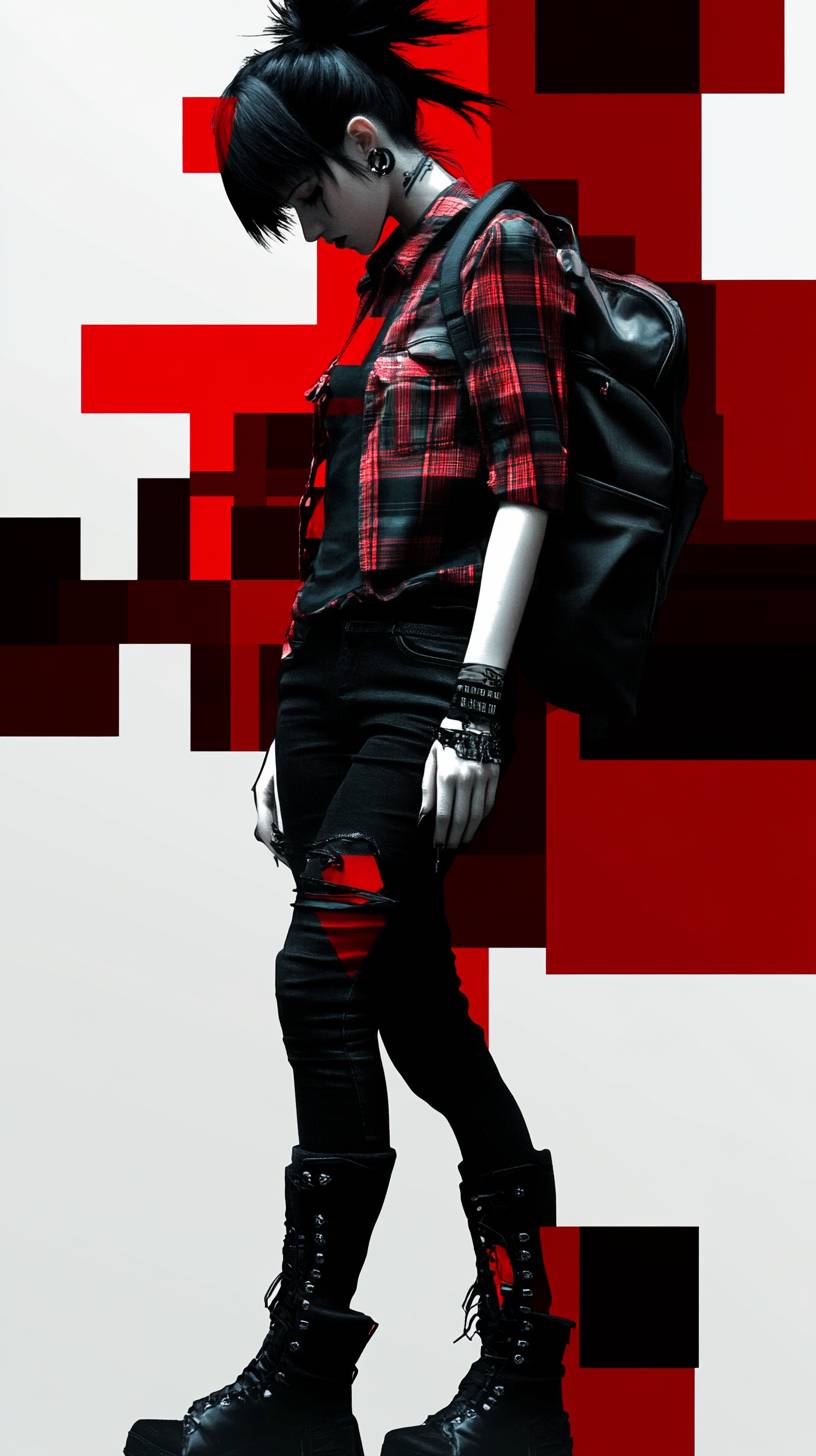 Anime female character, punk casual, plaid shirt, black jeans, boots, leather backpack, rebellious energy. --sref 3228145583 --ar 9:16