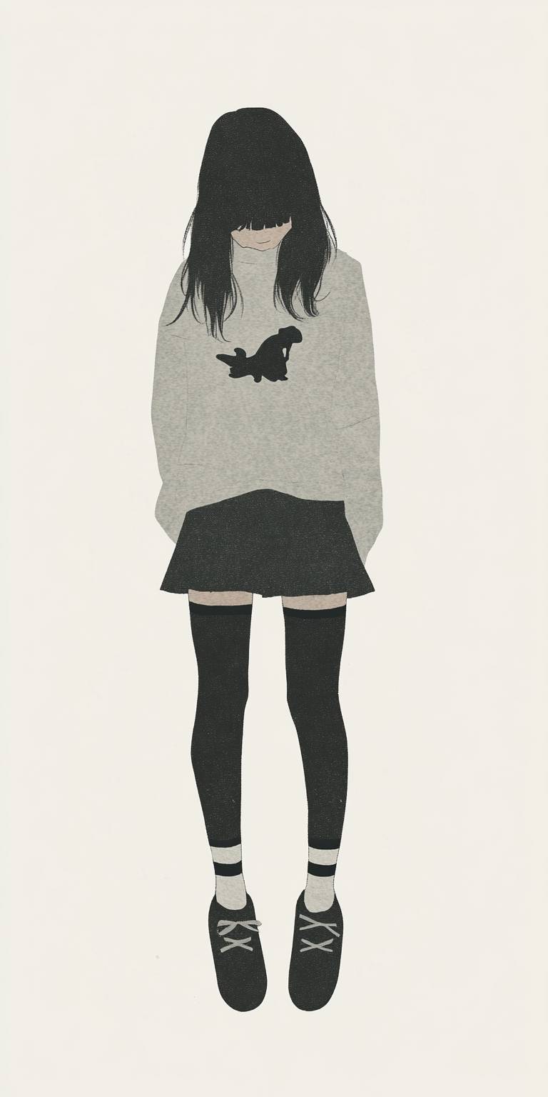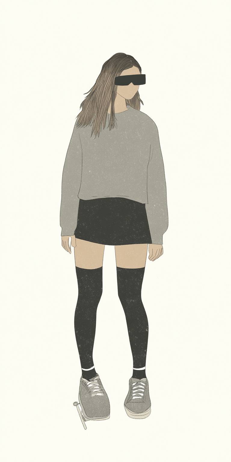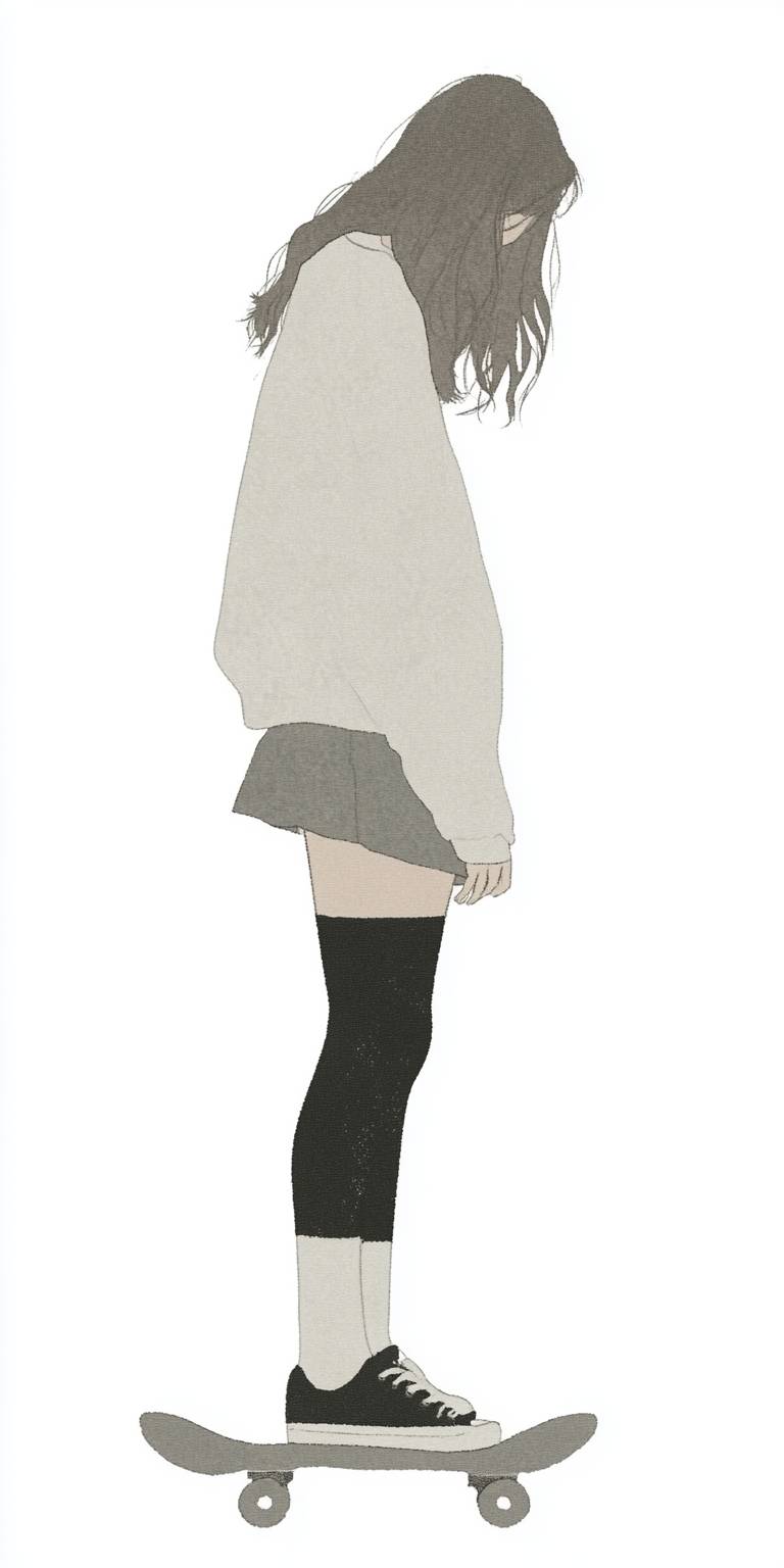 Chica de anime que lleva un suéter grande, una mini falda, medias hasta la rodilla y zapatillas, jugando en un parque de patinaje.