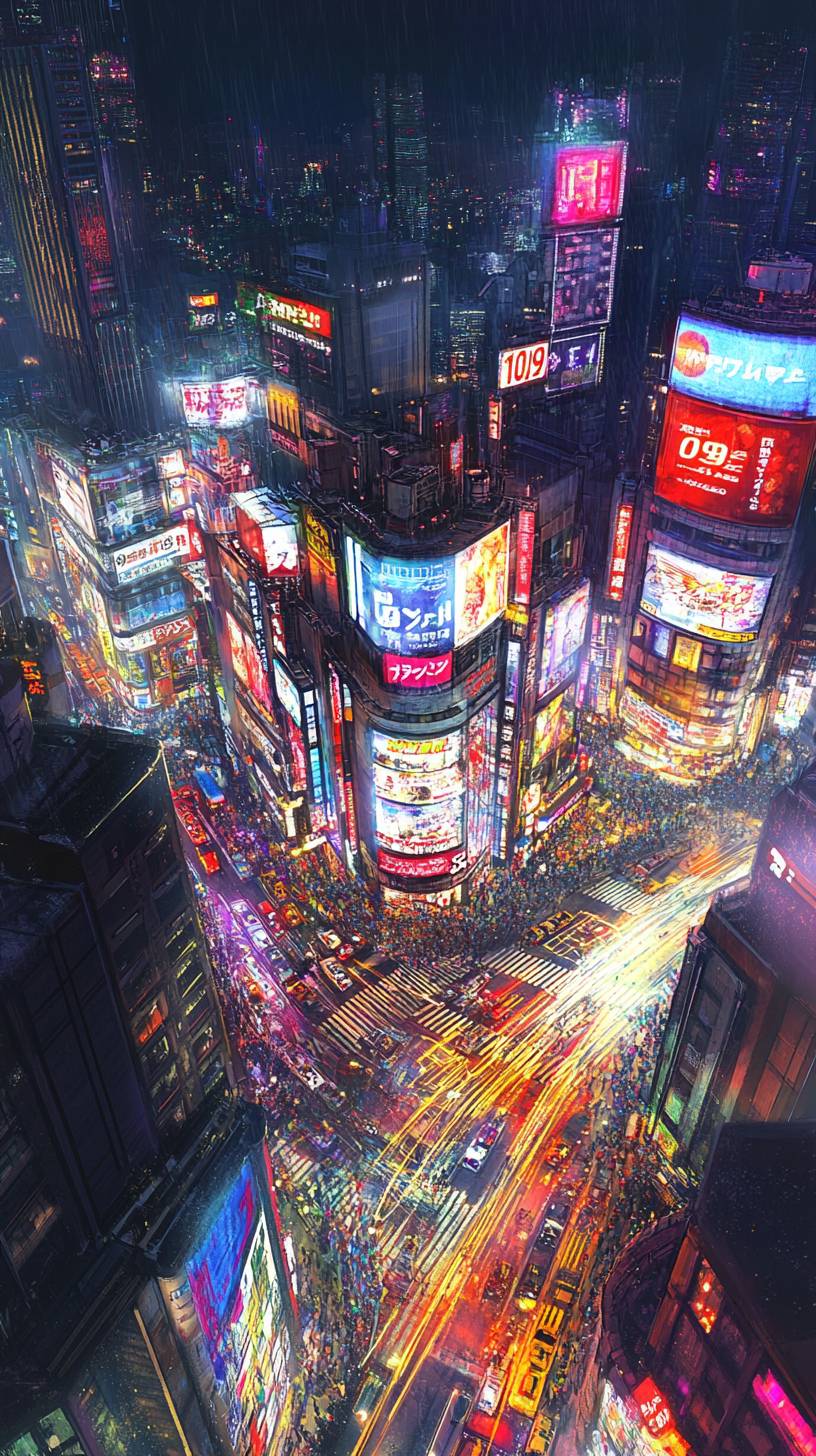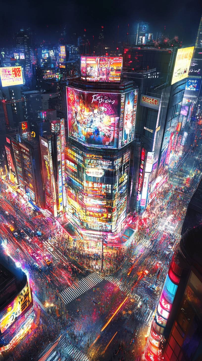 The Future View of Shibuya in 100 Years,realistic,high-quality,cyberpunk,A vibrant nighttime scene of Shibuya in Tokyo, featuring the famous Shibuya 109 building in the center, surrounded by brightly lit billboards and colorful neon signs, with busy streets and crosswalks filled with movement and light trails, creating a dynamic and energetic atmosphere, under a clear dark sky. --ar 9:16 --v 6.1