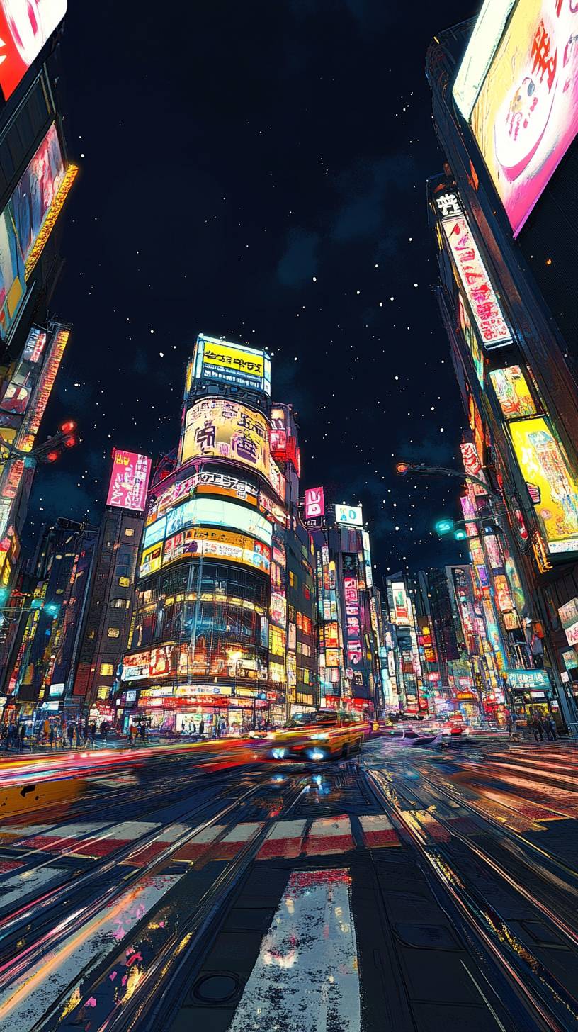 La vista futura de Shibuya en 100 años, realista, de alta calidad, ciberpunk, una escena nocturna vibrante de Shibuya en Tokio, con el famoso edificio Shibuya 109 en el centro, rodeado de vallas publicitarias iluminadas y coloridos letreros de neón, con calles y pasos de peatones concurridos llenos de movimiento y estelas de luz, creando una atmósfera dinámica y enérgica, bajo un claro cielo oscuro.