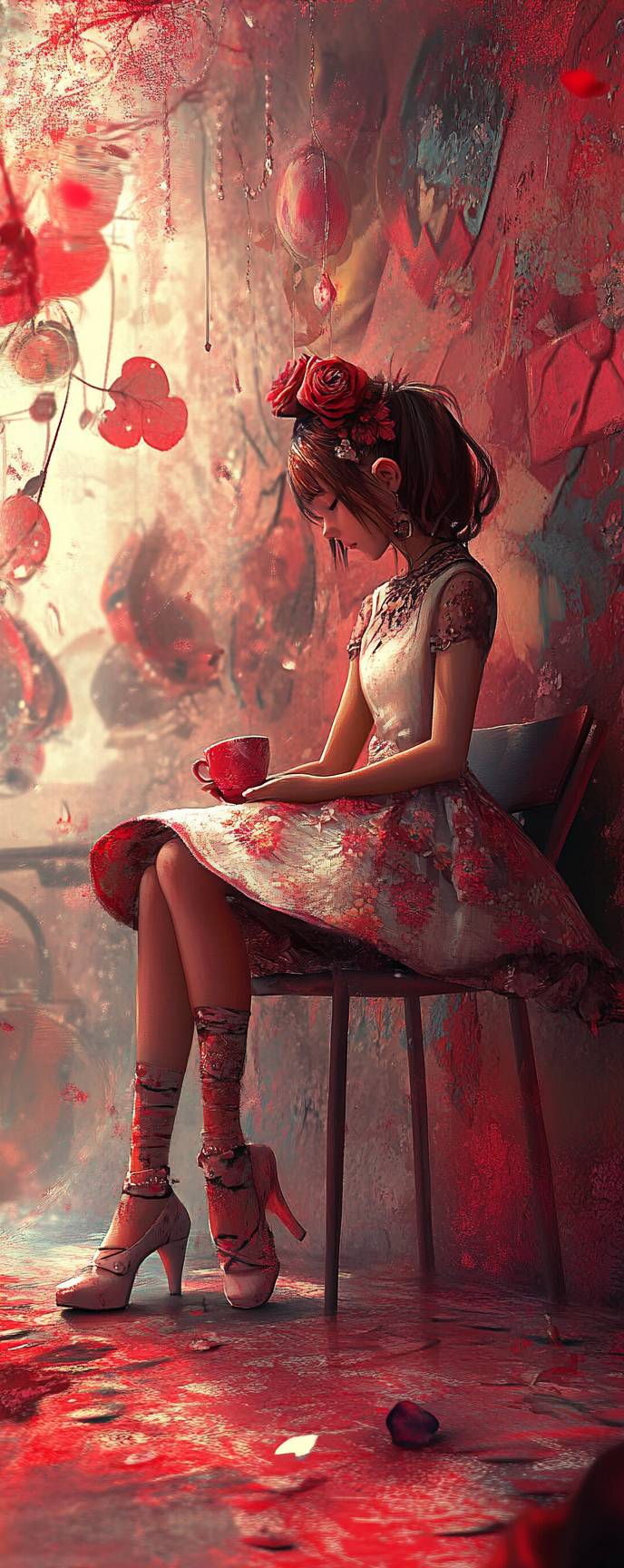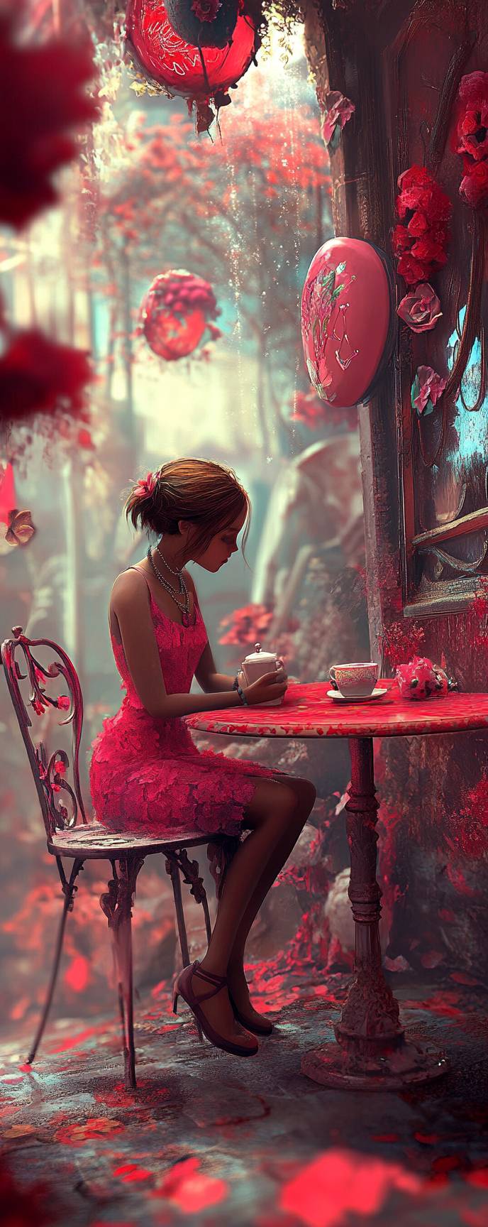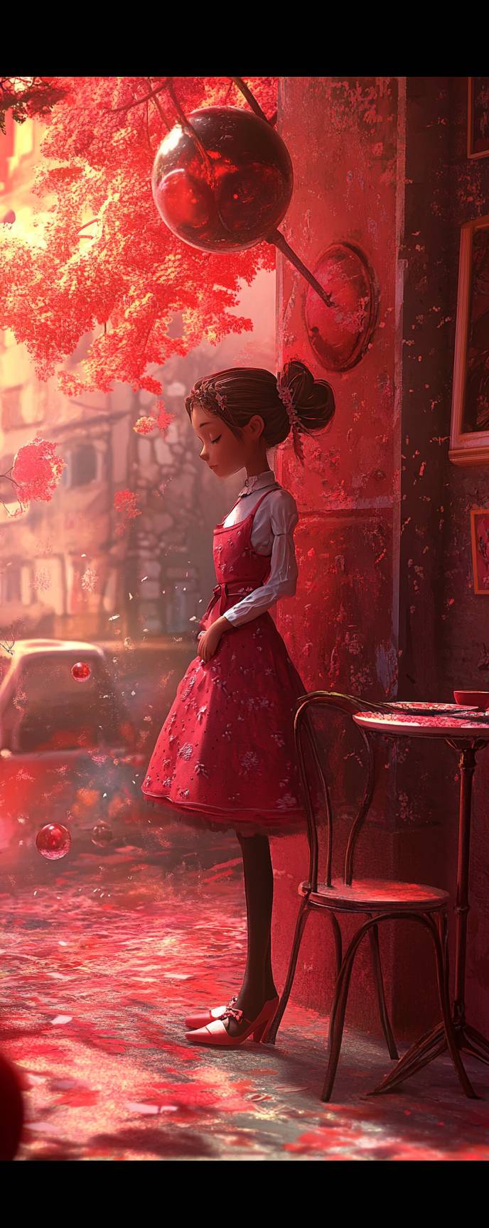 Chica de anime, elegante y simple, vestido midi, zapatillas de ballet, joyería minimalista, disfrutando de un ambiente de café relajado.