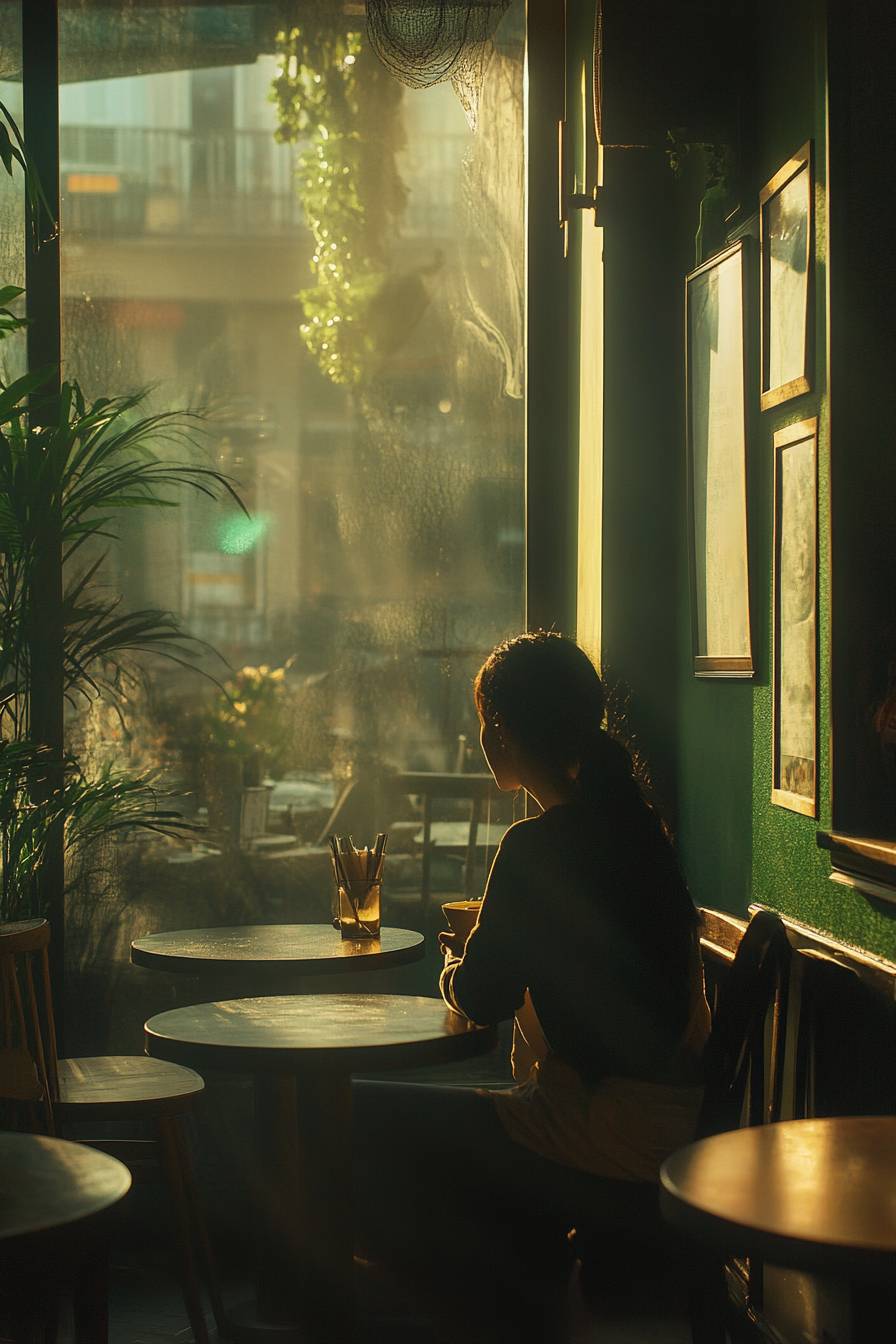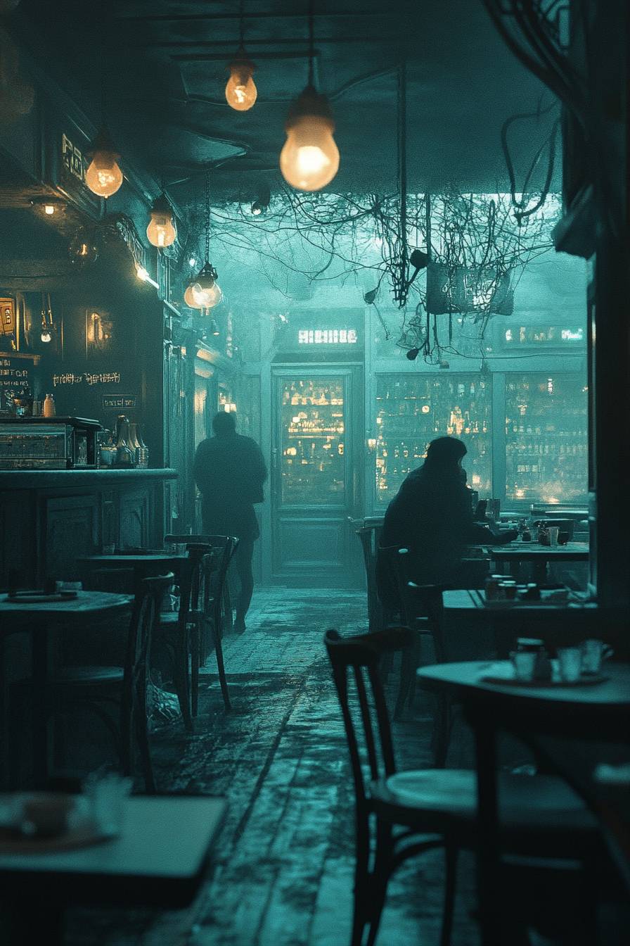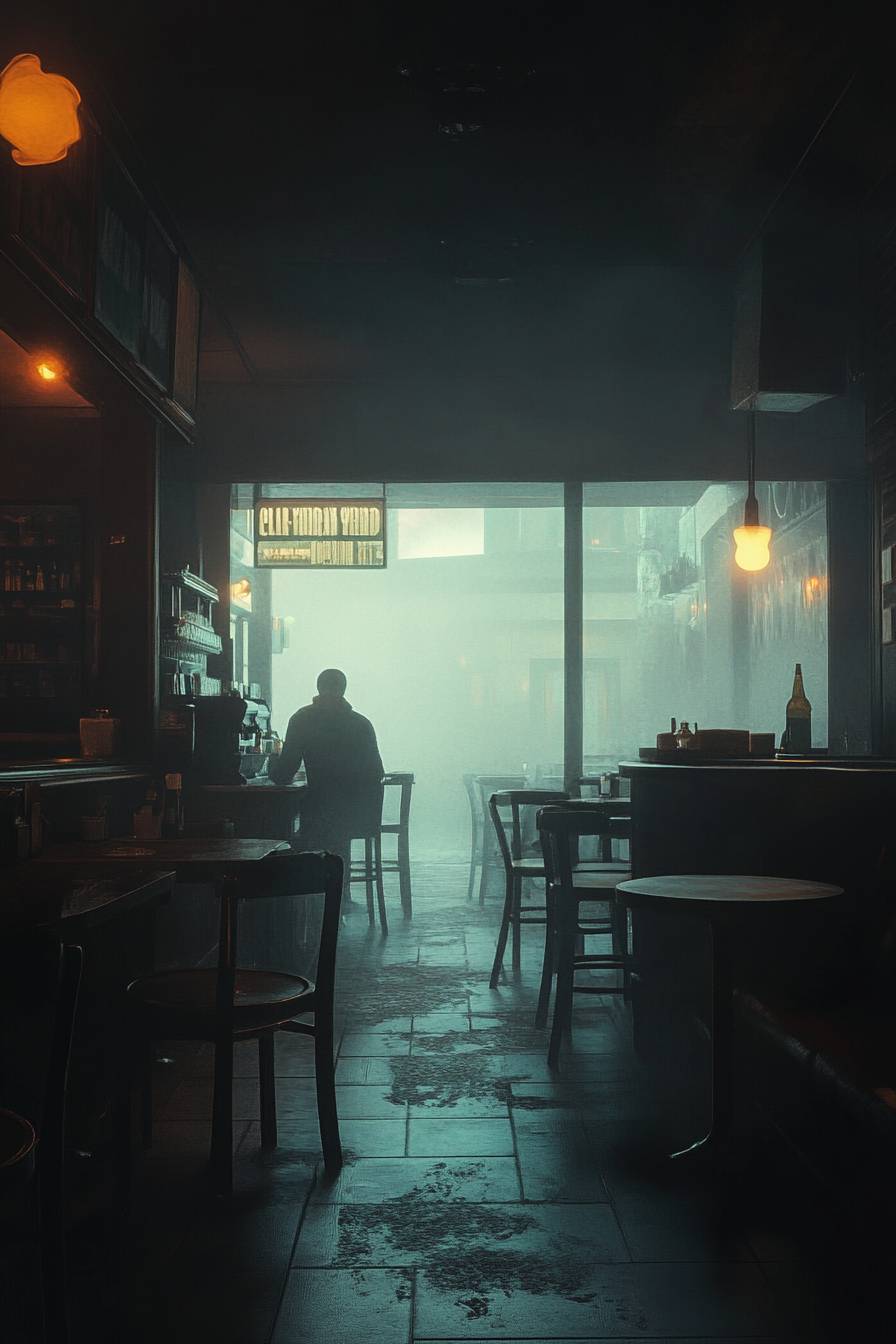 Escena cinematográfica en una cafetería con una atmósfera melancólica.