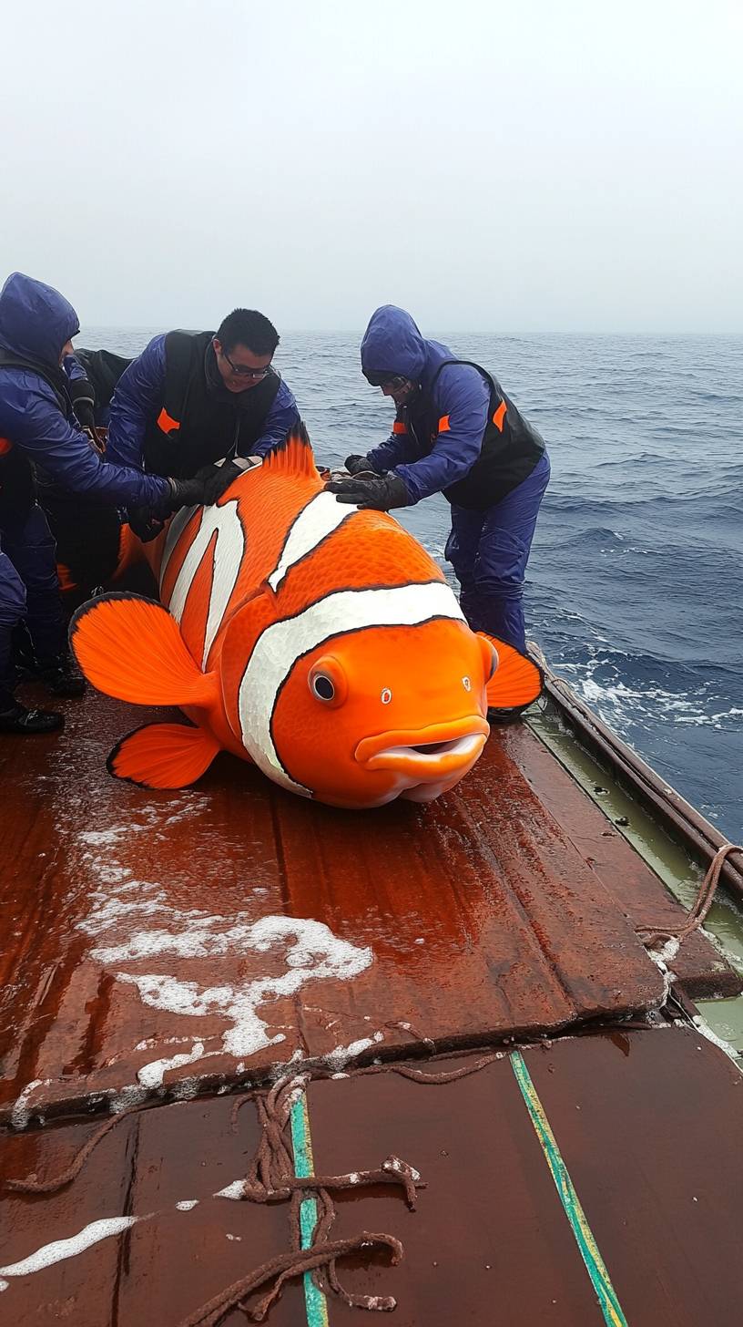 At the edge of the deck, four crew members are working together to push an enormous clownfish toward the sea. The clownfish's body towers over the crew, nearly filling the entire deck space. Its vibrant orange and white stripes glisten in the sunlight, with a wet, smooth surface and huge fins and tail resting on the deck. Water marks cover the deck, showing the slick traces left from moving it. The crew appears tiny next to this colossal creature. In the distance, the sea is shrouded in a thin mist, adding a mysterious touch. This is a real photo taken in 2024, realistic scene, high detail. --ar 9:16 --v 6.1