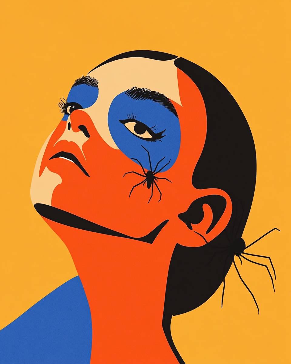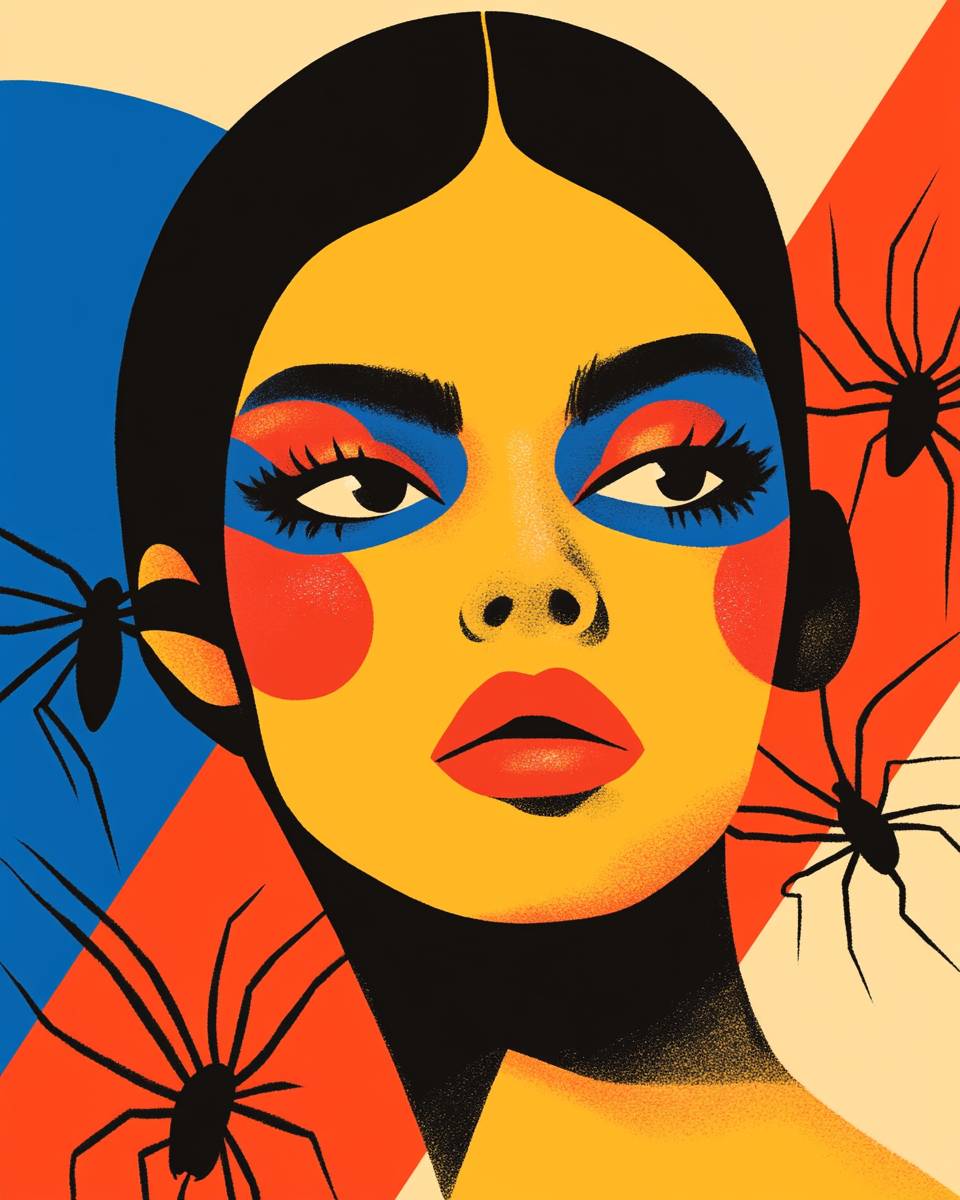 A flat illustration of Wednesday Adam’s, flat illustration, heavy makeup, spiders, gauche risograph, bold colors --ar 4:5 --personalize uufaali --v 6.1