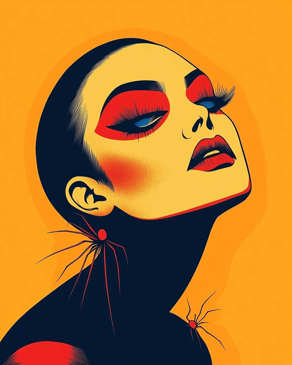 Una ilustración plana de Wednesday Adams con maquillaje intenso, arañas y colores audaces.