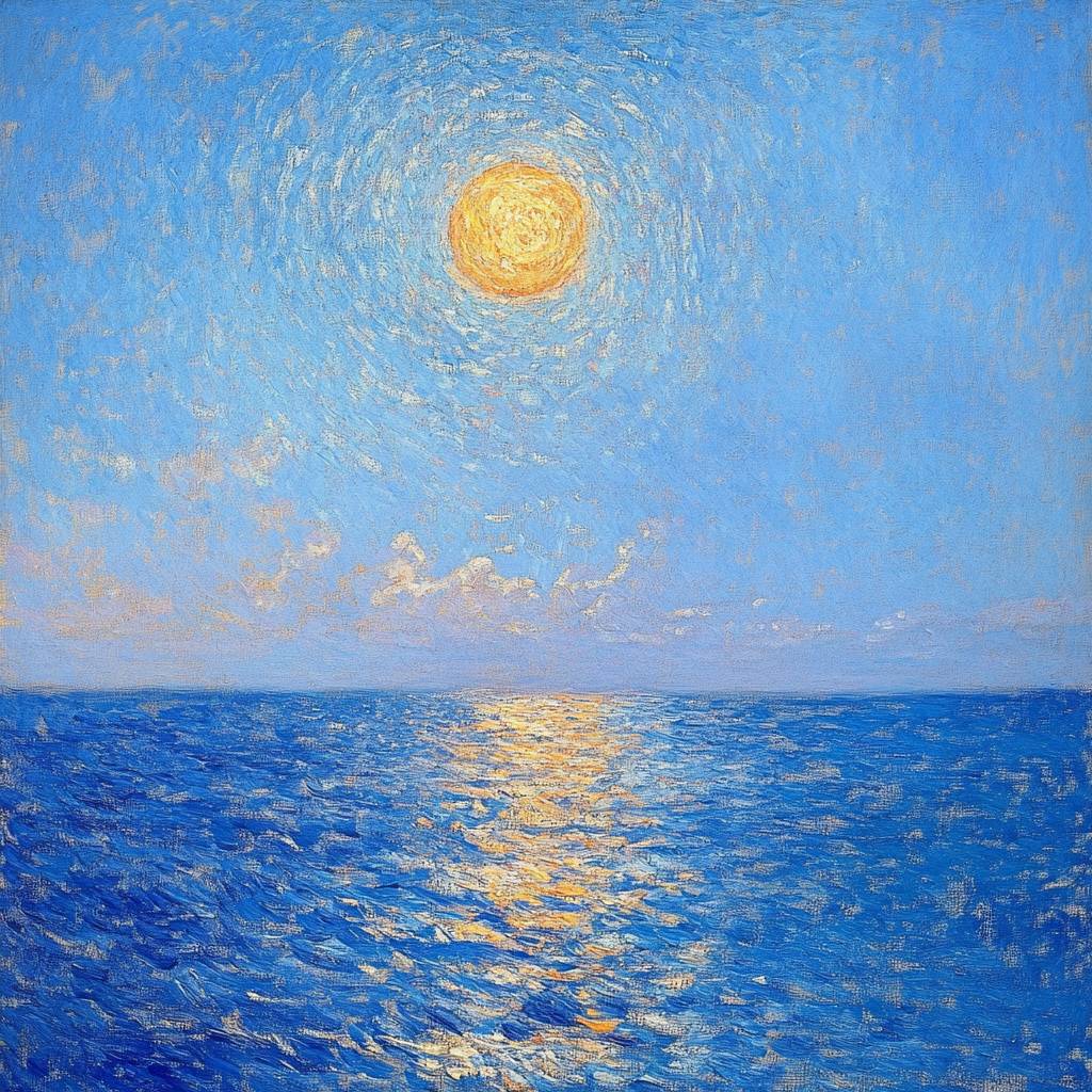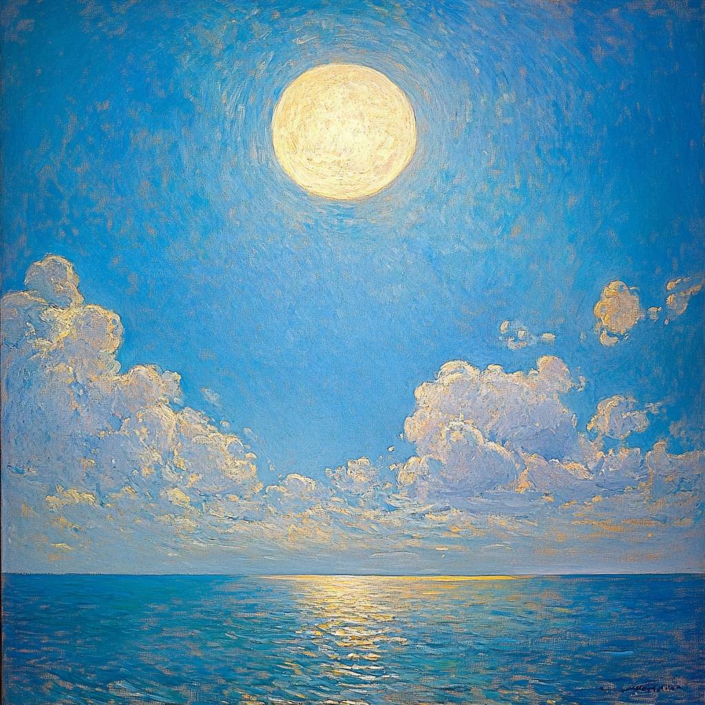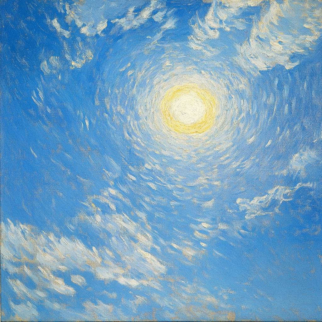 Una pintura de la década de 1890 en el estilo impresionista francés, que representa el sol flotando en un cielo azul.