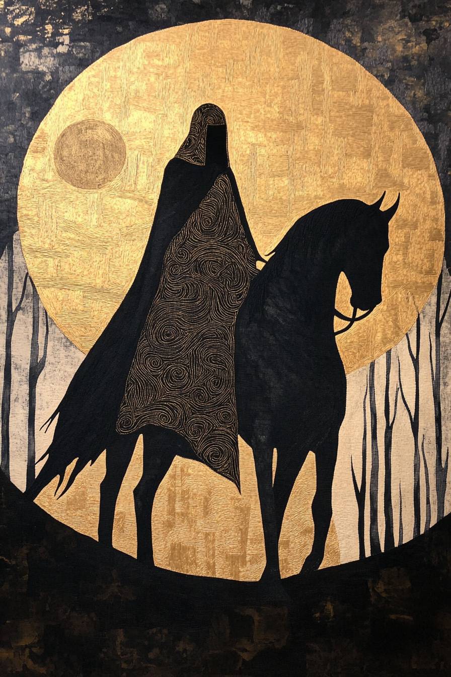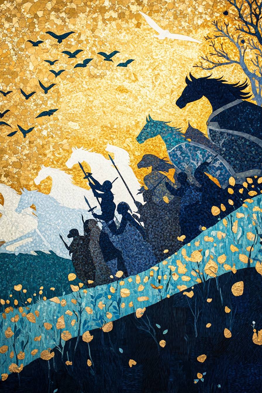 La tapicería de Bayeux presenta una era pasada de héroes y bestias, fusionando la estética del anime con intrigantes contrastes en oro y plata.