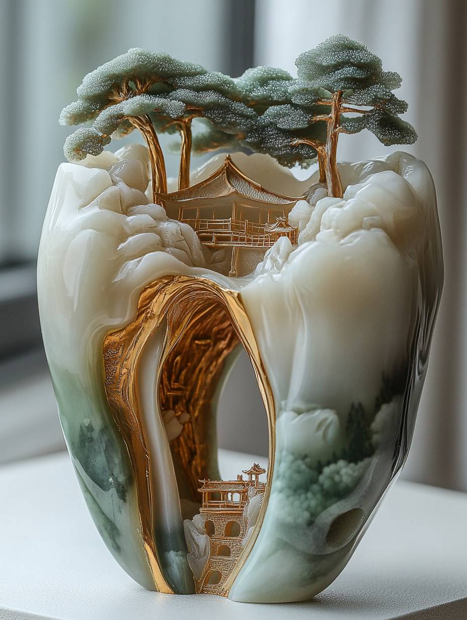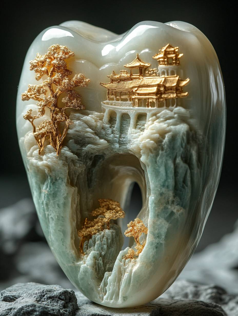 Dentro de un molar completo hay una exquisita escultura de jade incrustada en oro en 3D, con un diseño intrincado y elementos de pintura de paisaje chino, con textura de cristal y un estilo minimalista.