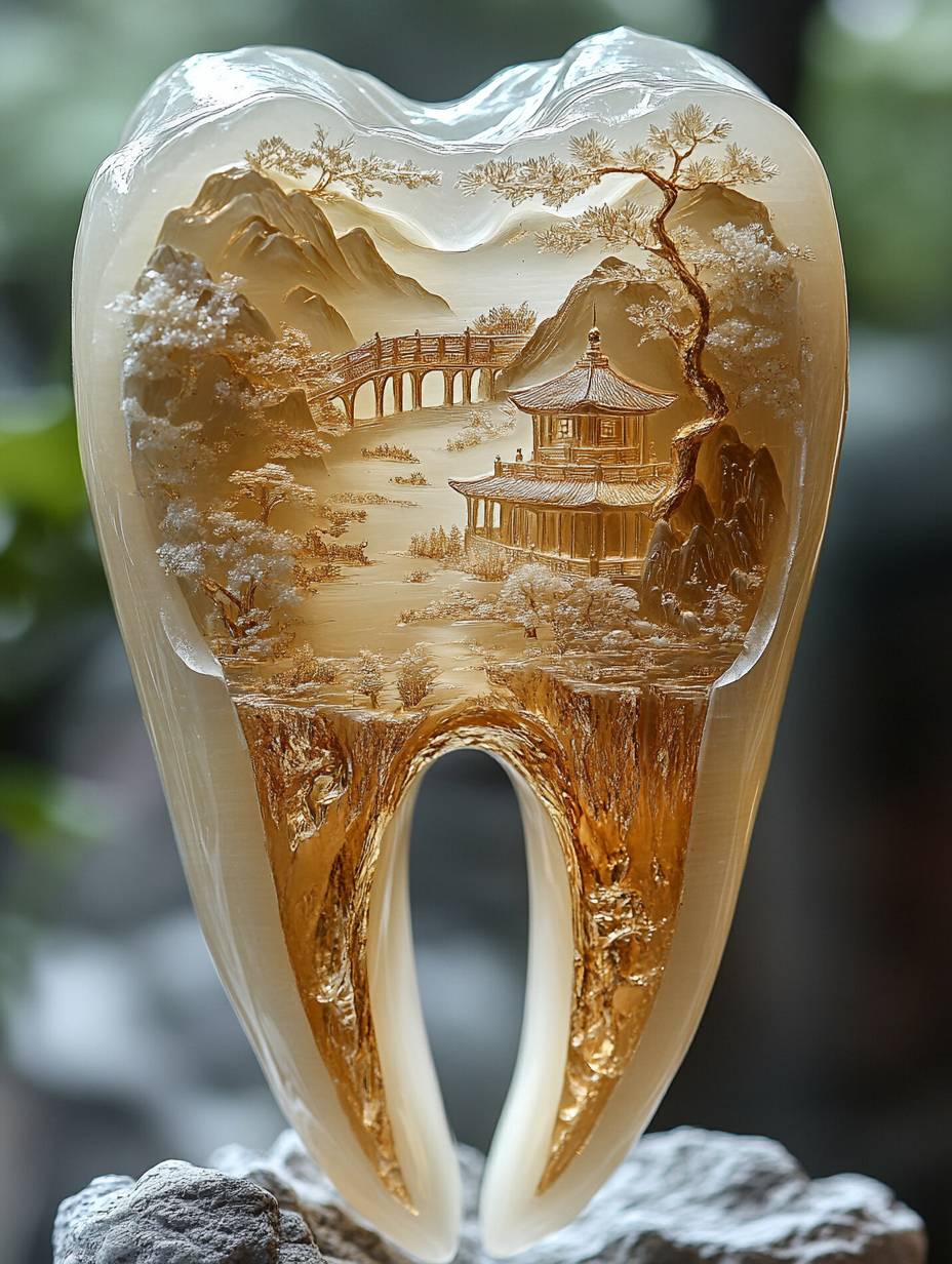 Dentro de la sección transversal de un molar completo, hay una enorme y exquisita escultura de jade con incrustaciones de oro en 3D, con un diseño intrincado y elementos de pintura de paisaje chino, textura de cristal, estilo minimalista y super alta detalle.