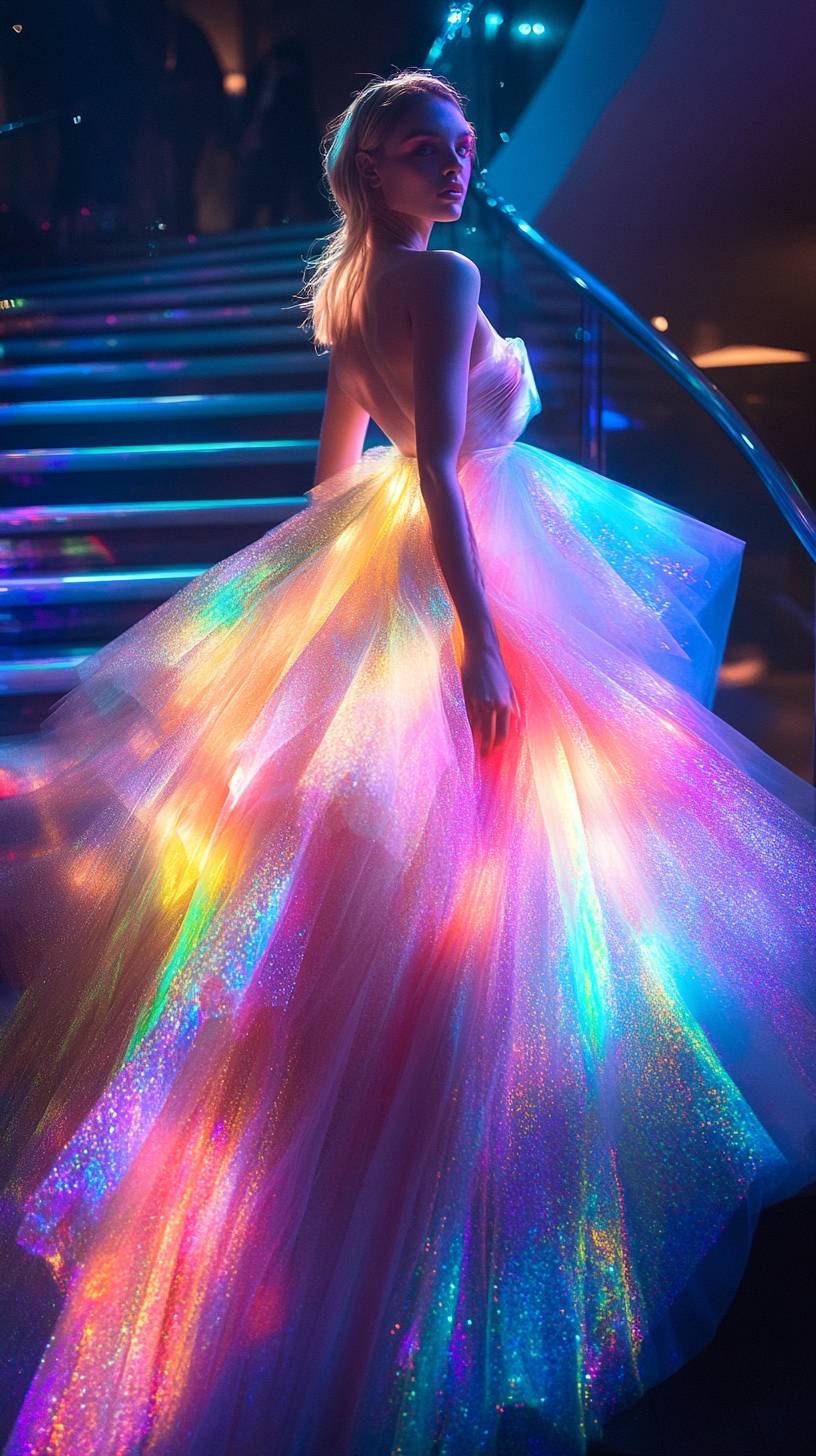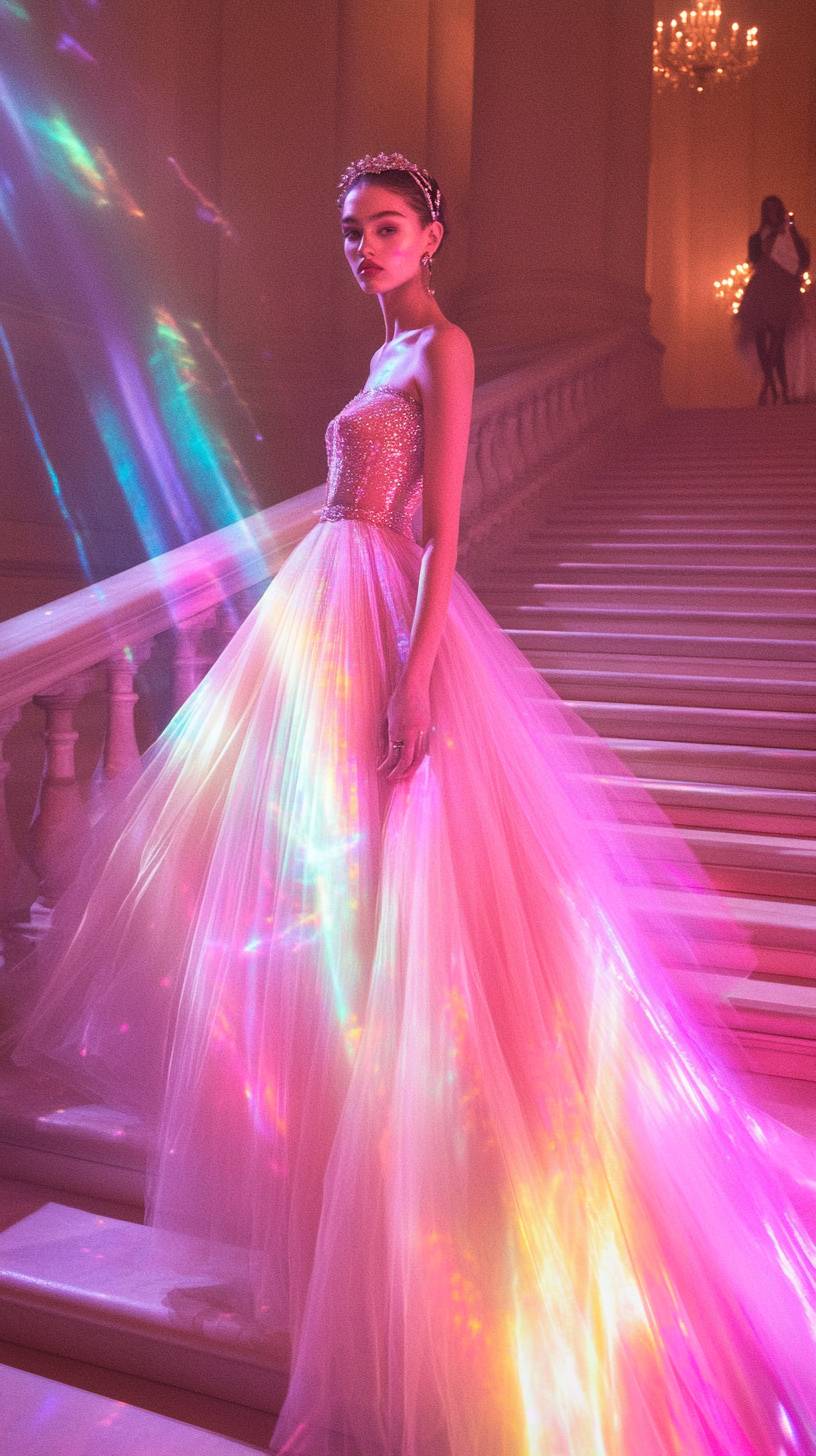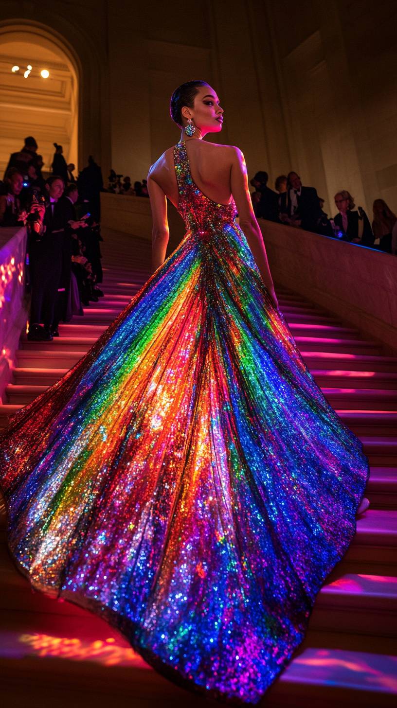 A full-body shot of a real-life model on the grand staircase at the Met Gala, event theme: rainbow lights, facial features in ultra-high definition, surrounded by luxurious decor, evening atmosphere, softly illuminated, shot with a Fujifilm GFX 100S and 200mm f/2.8 lens for sharp detail, soft pastel tones --ar 9:16 --v 6.1