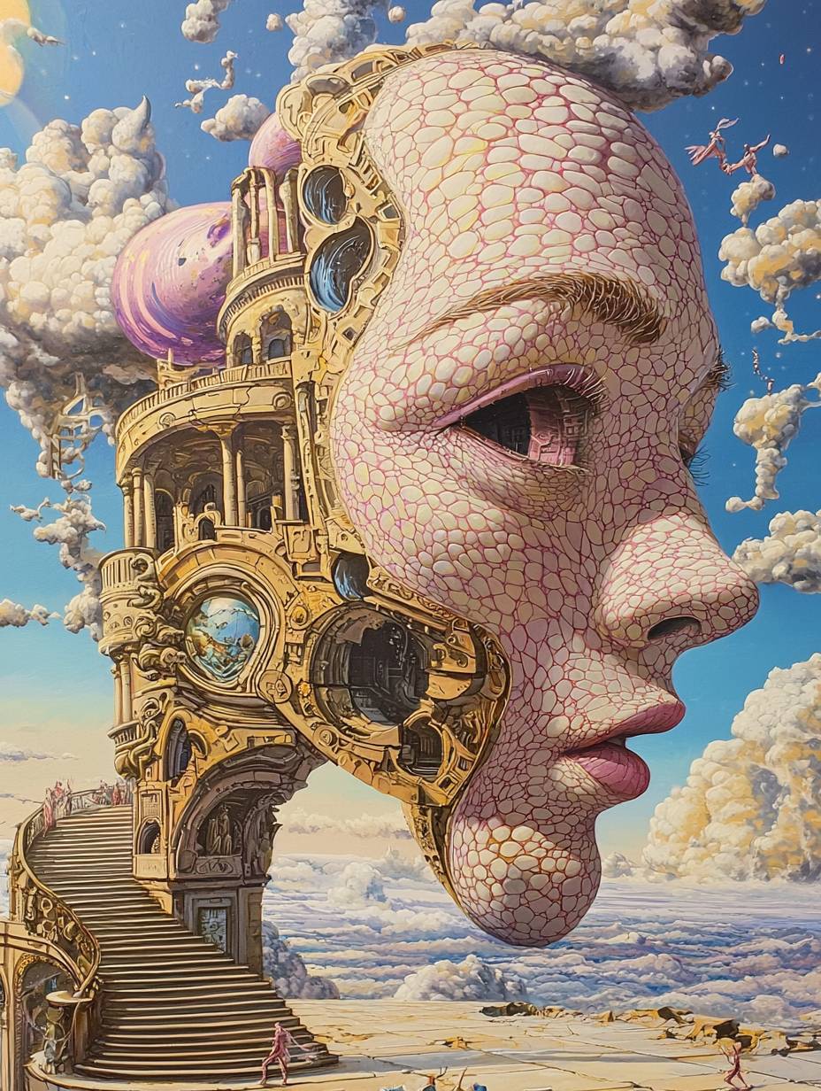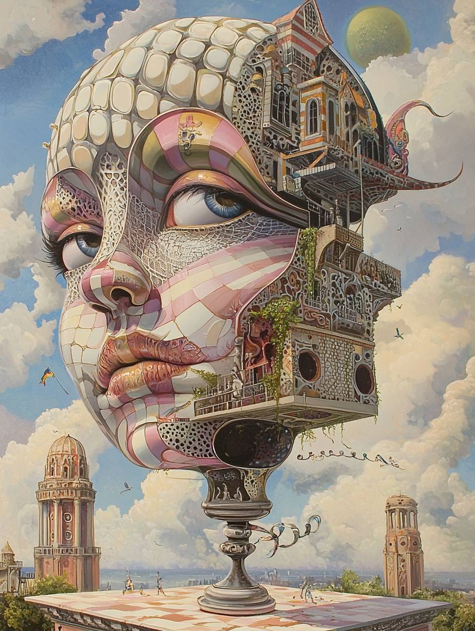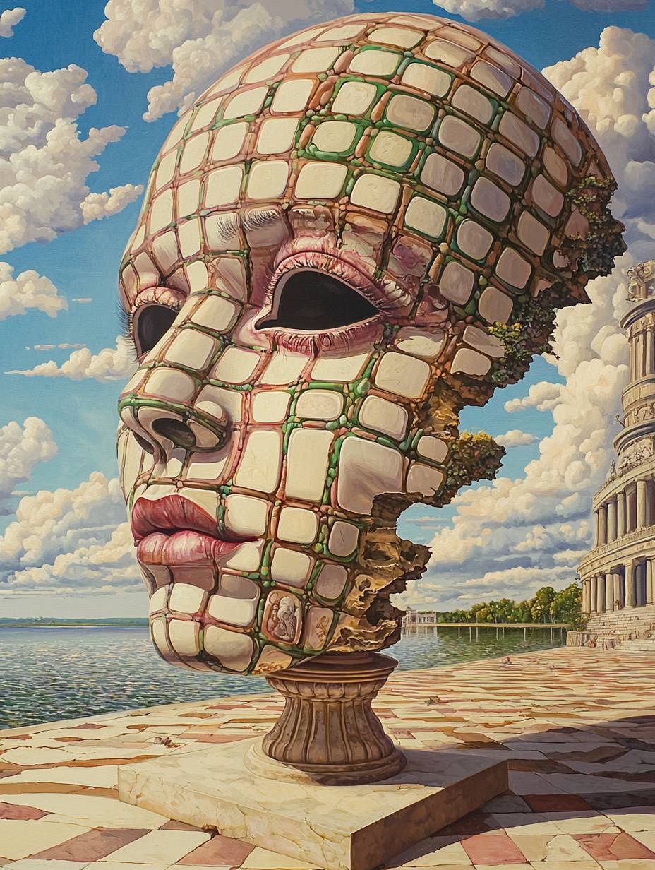 Una pintura al óleo de Jacek Yerka y Lisa Frank, que representa una máscara en un pedestal.