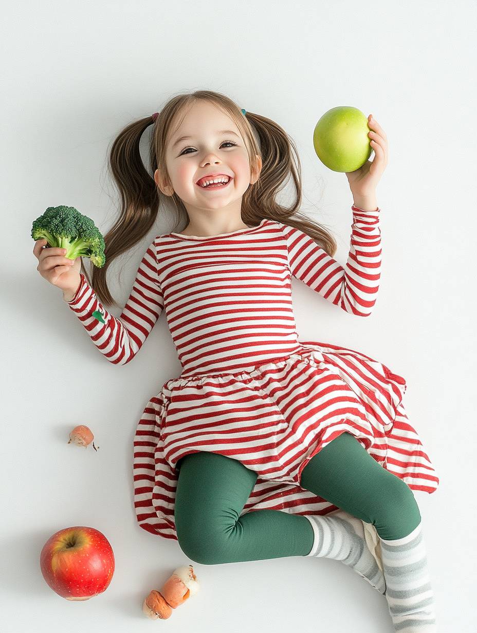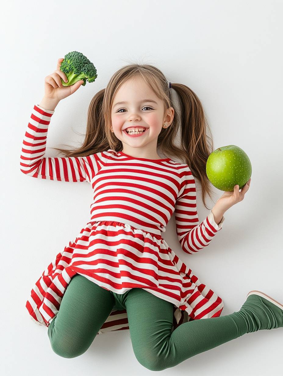 Una niña de 12 años tumbada en el suelo con dos coletas que lleva un vestido de rayas rojas y blancas y mallas verdes sonríe y sostiene un brócoli en una mano y una manzana en la otra, justo encima de sus ojos, fondo blanco.